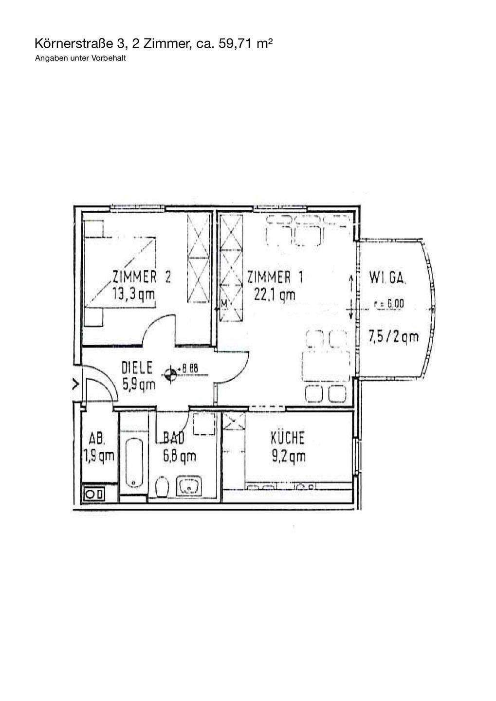 Zimmeranzahl :2 Gesamtgröße :ca. 59,00 m² Wohnfläche :ca. 59,70 m² Baujahr :1994 Frei ab :Bezug: nach Vereinbarung Etage :3 Energieausweis :