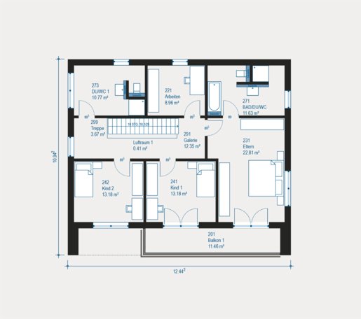 Das Obergeschoss beeindruckt mit einem intelligenten Zusammenspiel aus Privatsphäre und Gemeinschaft: Zwei Kinderzimmer mit eigenem Bad, ein weiterer Arbeitsraum sowie der exklusive Elternbereich mit Ankleide und Wellnessbad machen Highline 4 zu einem Rückzugsort voller Komfort und Stil.