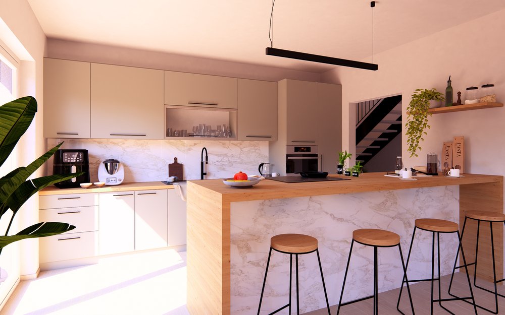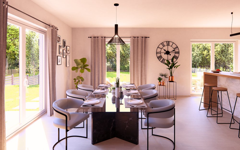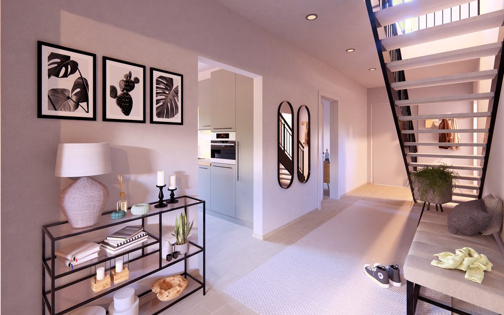 Im Erdgeschoss öffnet sich ein weitläufiger Wohn-, Ess- und Kochbereich, der Offenheit und Leichtigkeit ausstrahlt. Ein Arbeitszimmer mit direktem Zugang zur Terrasse, eine praktische Ankleide sowie ein zusätzliches Bad ergänzen das Konzept und schaffen Flexibilität für individuelle Lebensentwürfe.