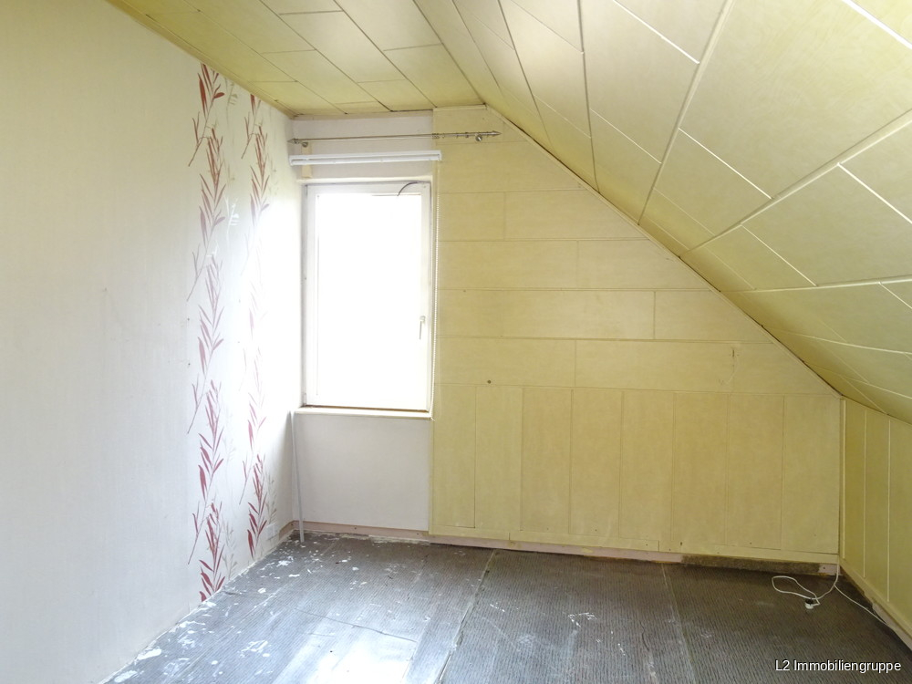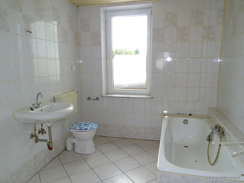 Obergeschoß: Tageslichtbad auf halber Treppenhöhe mit Wanne, Dusche und Toilette, großer Flur, Wohnzimmer mit Ofen (mit Öleinsatz), Küche mit Fenster, Schlafzimmer
