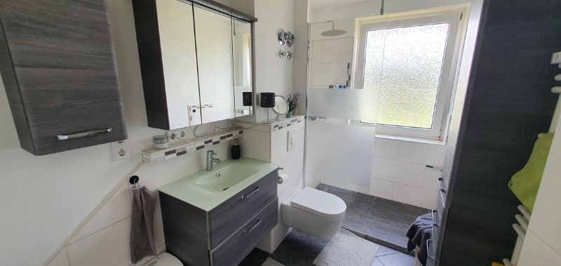 Die Wohnung wurde 2017 vollständig modernisiert. Eine gut ausgestattete Einbauküche, inkl. Geschirrspüler, sowie ein voll eingerichtetes Duschbad sind vorhanden. Ein Stellplatz gehört zur Wohnung. Abstellmöglichkeiten bietet der Kellerraum und Dachboden, zudem ist ein kleiner Abstellraum in der Wohnung.