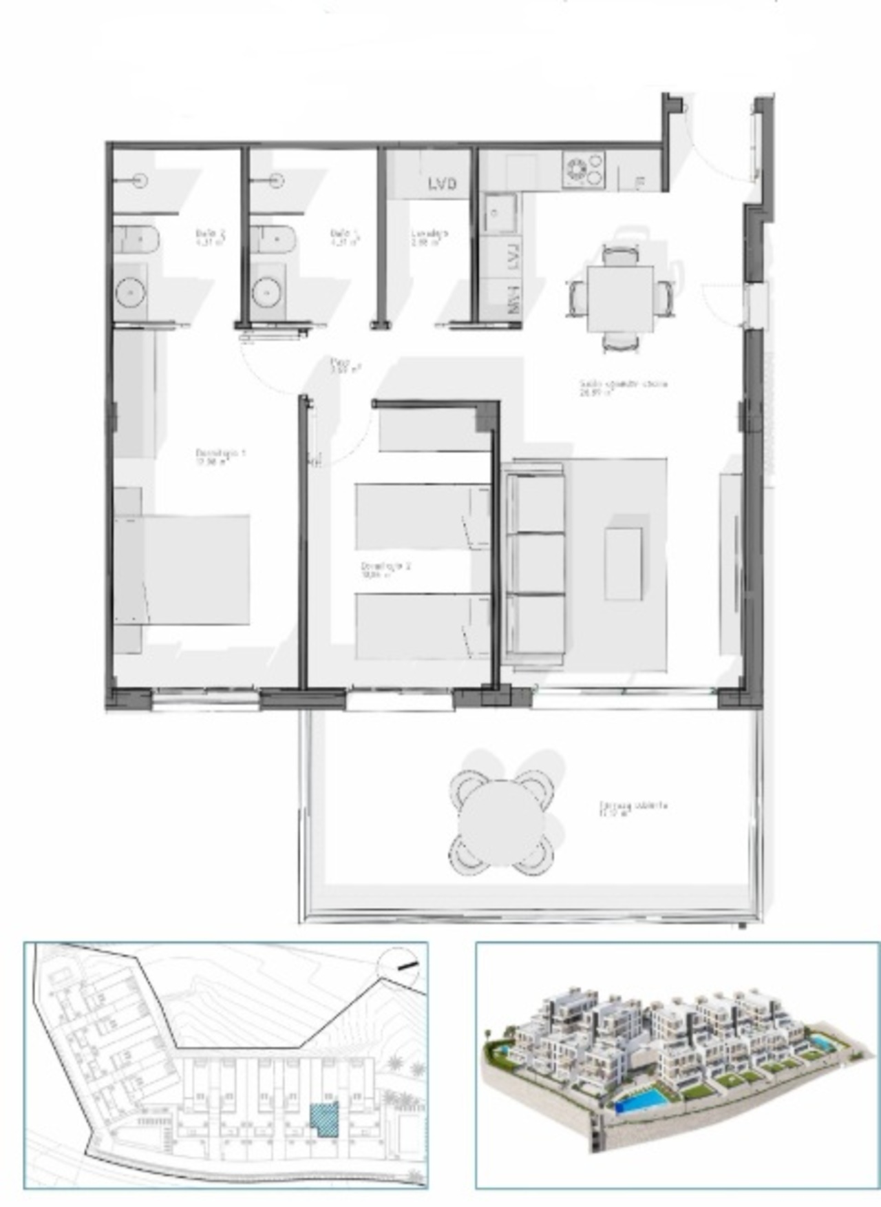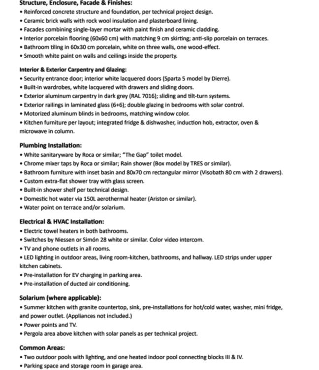 This resort stands out for its excellent properties, offering spacious terraces on the ground floors and solarium on the upper floors with a pergola area above the summer kitchen. There are blocks of 12 apartments with only 2 properties per floor, it means ground level plus 5 floors.
