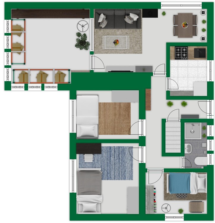 Obergeschoss (Hauptebene – ca. 105 m² Wohnfläche, ebenerdig zum Garten): Über eine Treppe von der Einfahrt gelangt man in das eigentliche Wohngeschoss. Hier befinden sich eine Küche mit moderner Einbauküche, ein Badezimmer (mit Fenster, Dusche, WC und Waschtisch), ein Wintergarten sowie drei weitere Zimmer, die flexibel als Schlafzimmer, Arbeitszimmer oder Wohnzimmer genutzt werden können.