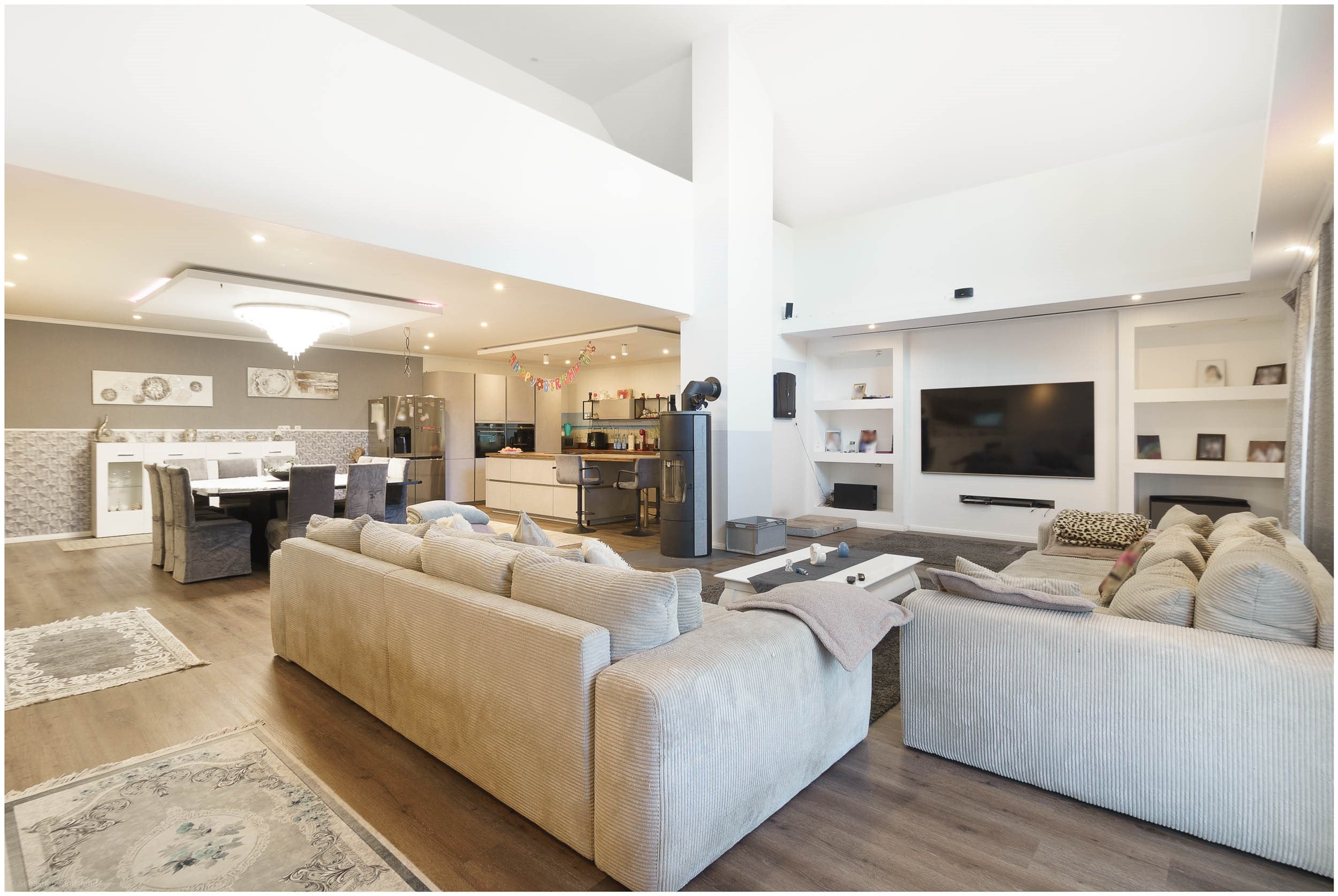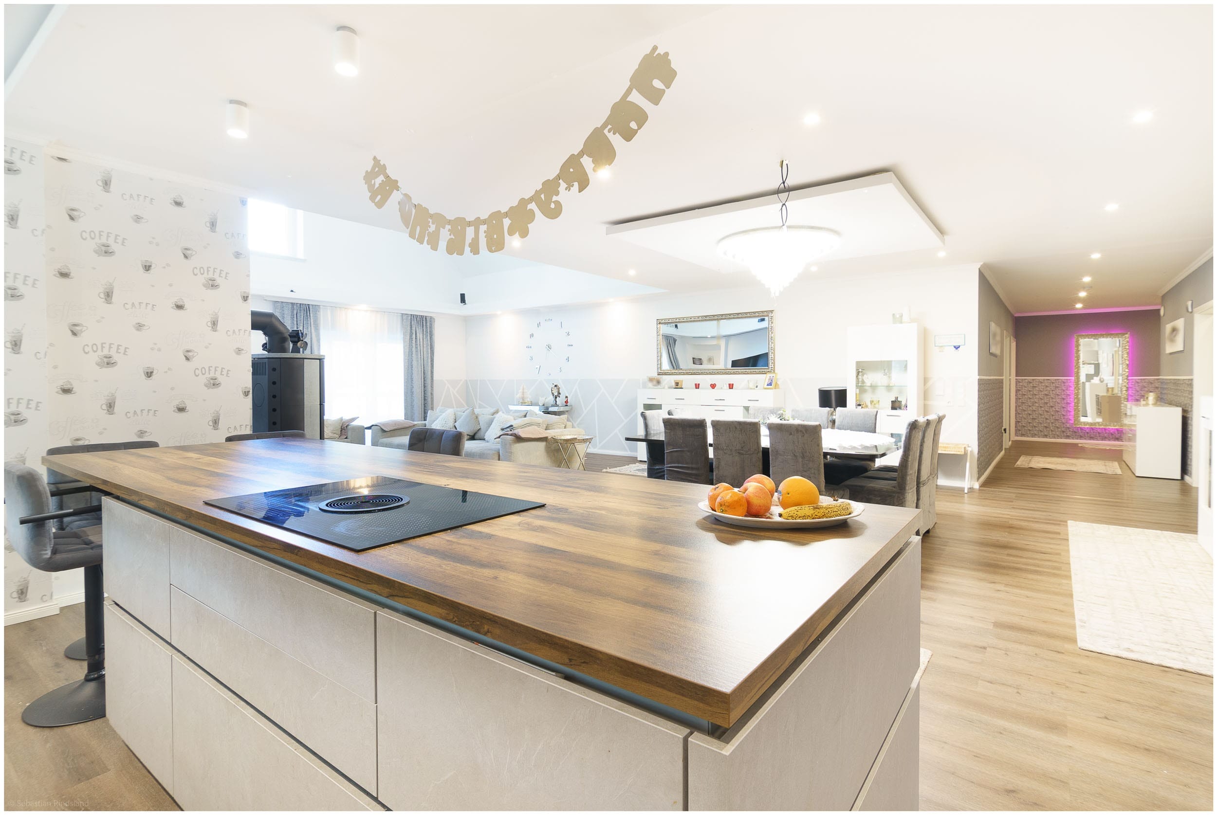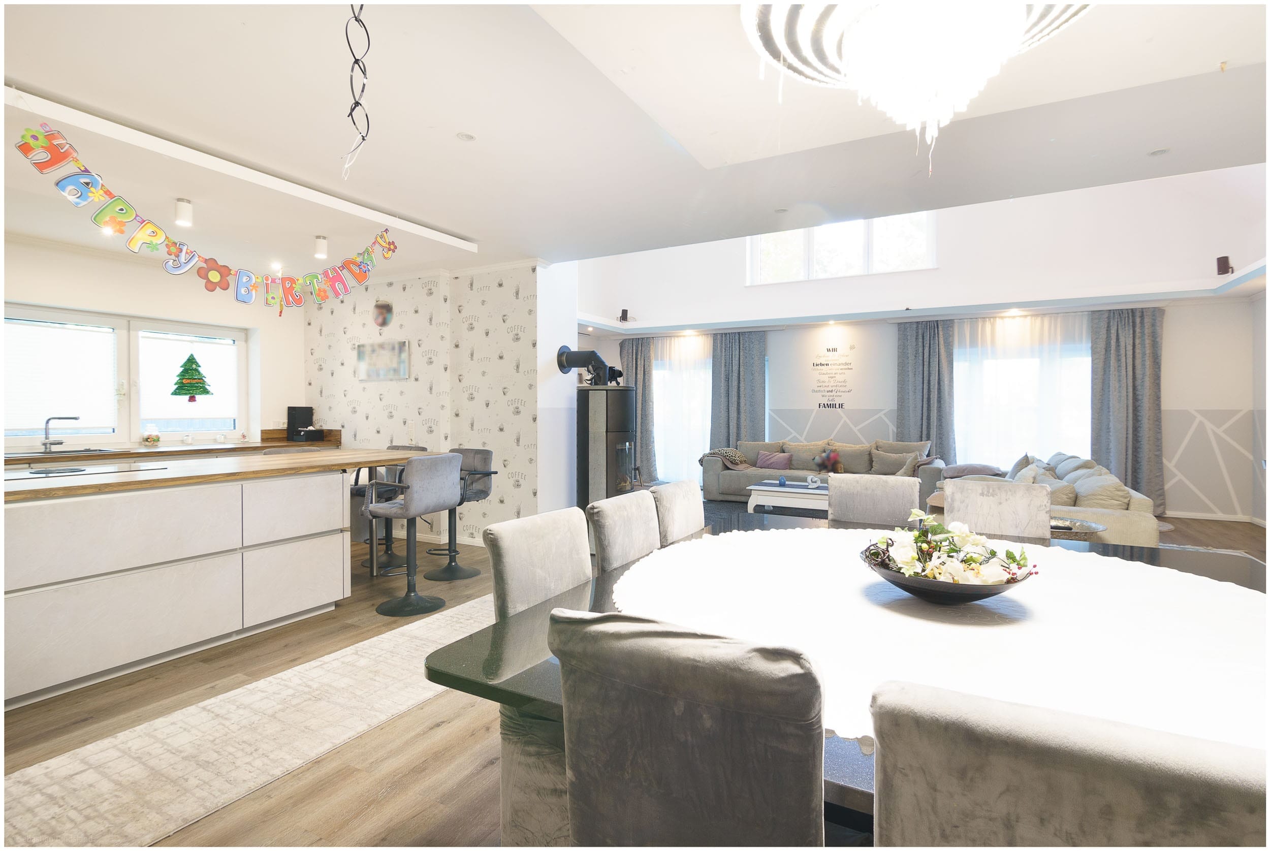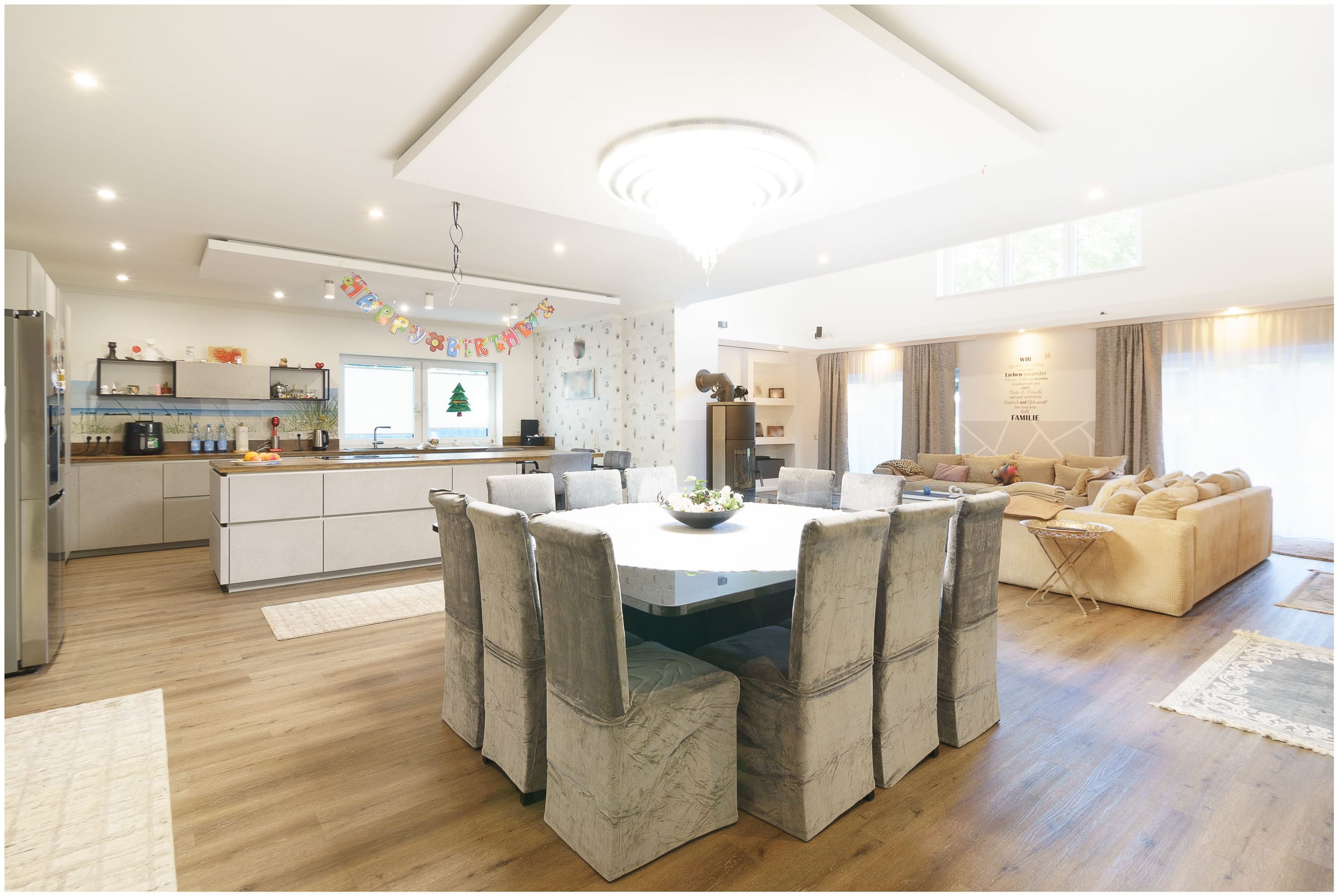 • Offener Wohn-, Koch- und Essbereich mit moderner Küchenzeile