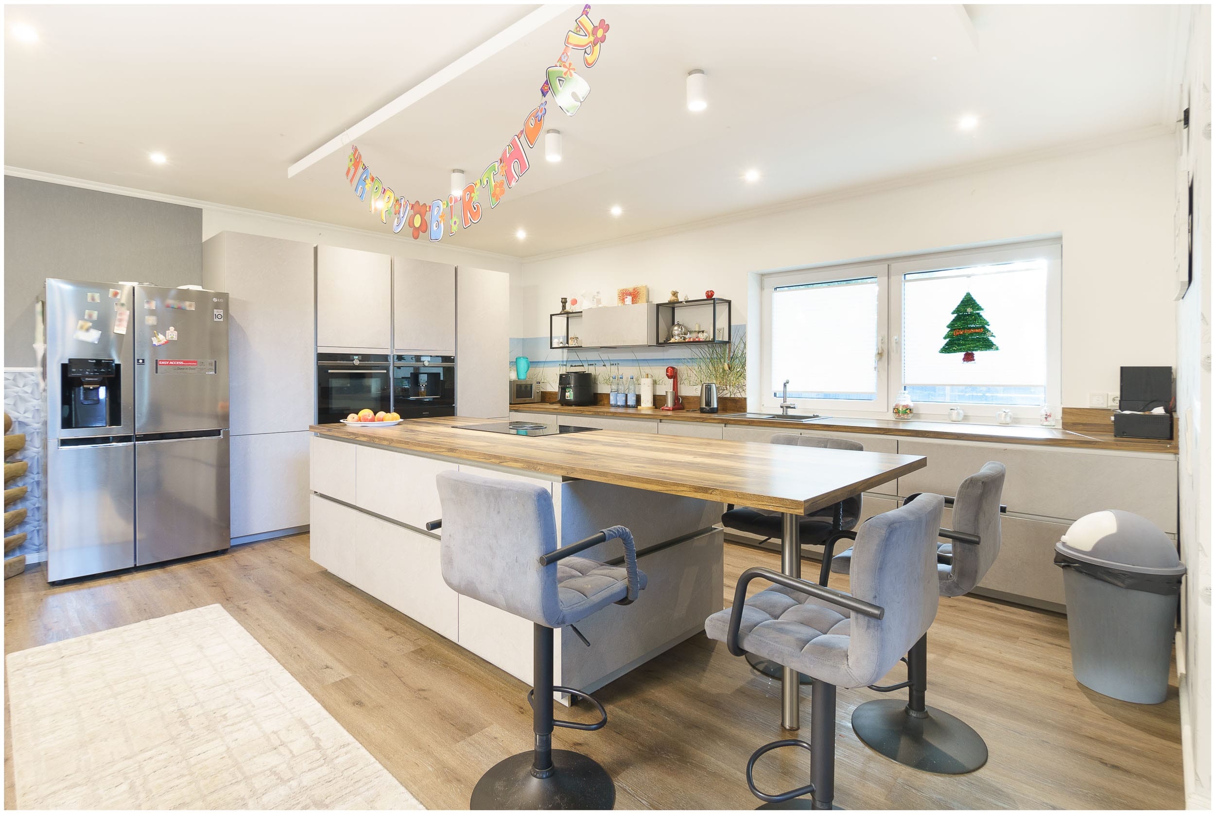 Die moderne Küche ist mit hochwertigen Elektrogeräten ausgestattet und fügt sich harmonisch in den Wohn- und Essbereich ein.