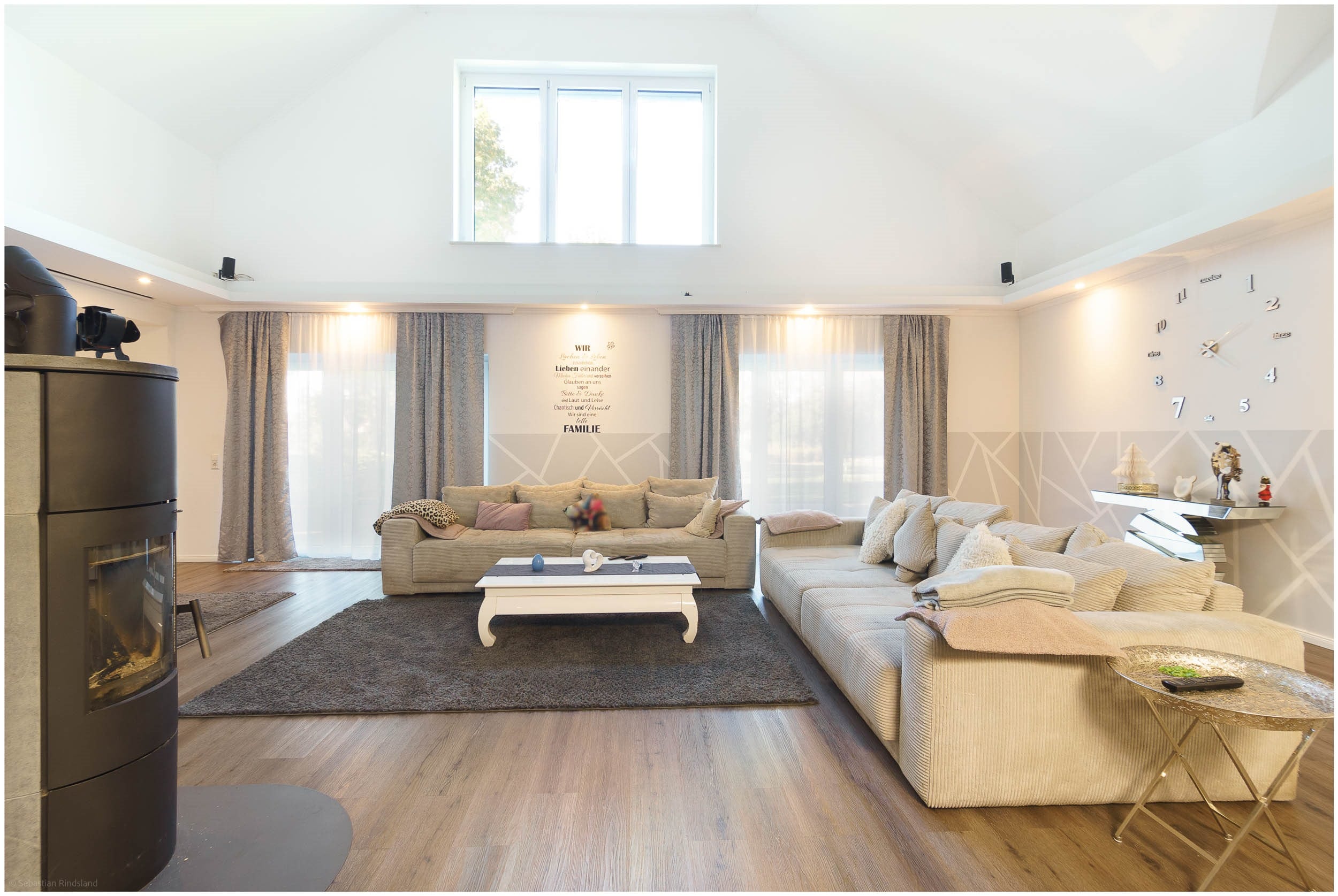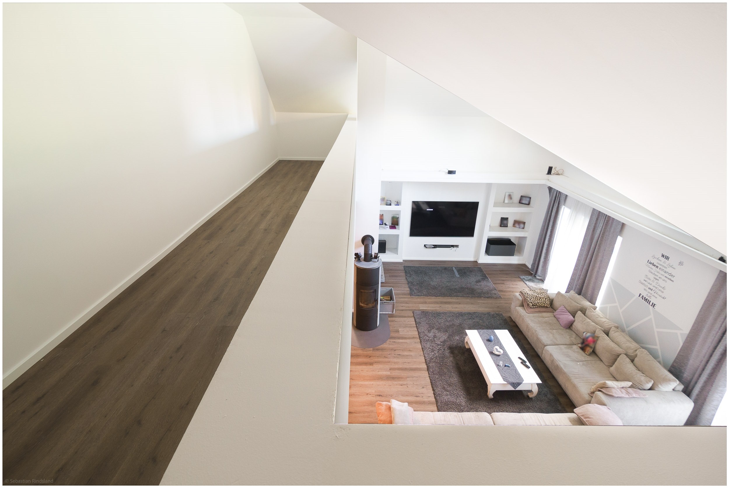 • Wohnbereich mit Kamin und Galerieöffnung nach oben