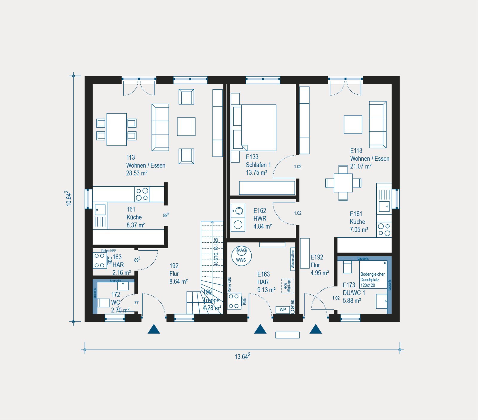 Für modernen Wohnkomfort sorgen bei deinem Haus eine energieeffiziente Luft-Wasser-Wärmepumpe, eine kontrollierte Be- und Entlüftungsanlage mit Wärmerückgewinnung sowie unser durchdachtes Heizungs- und Elektropaket. Auch die Haustechnik inklusive Rohrleitungen ist bereits vollständig enthalten.