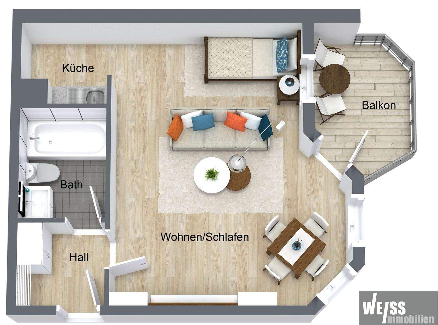 Wohnen-Schlafen - Vollmöblierte 1 Zimmer EG-Whg. mit TG-Stellplatz und Balkon
