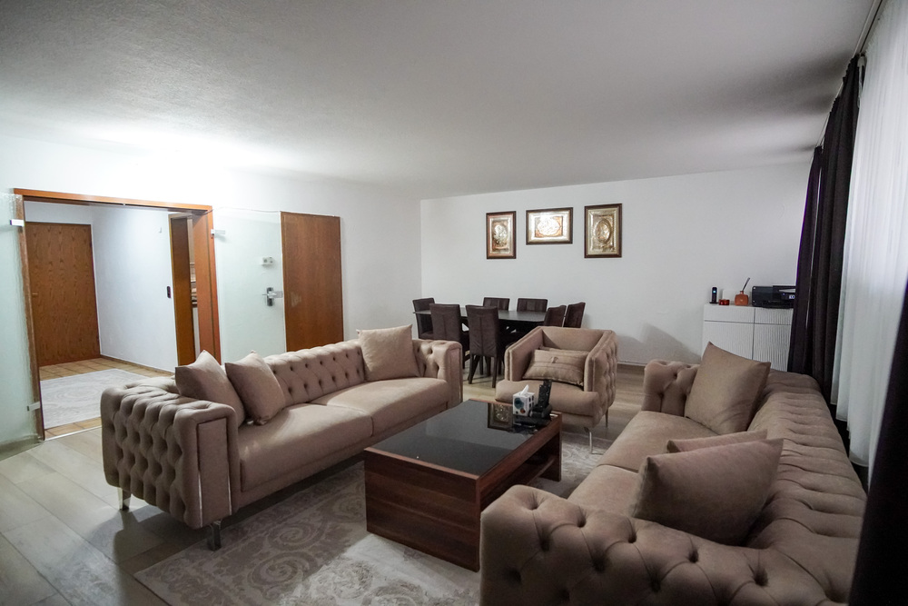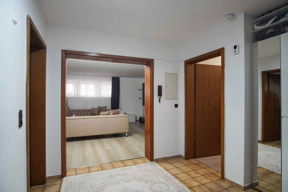 Die Wohnung im Obergeschoss überzeugt auf ca. 116 m² durch eine großzügige und funktionale Raumaufteilung mit vier Zimmern. Von der Diele aus sind die Küche, das Gäste-WC sowie der weitläufige Wohn- und Essbereich zugänglich. Ein weiterer Flur führt zum Badezimmer mit Wanne und Dusche sowie zu drei hellen Schlafzimmern – perfekt für Familien oder Paare mit Platzbedarf.