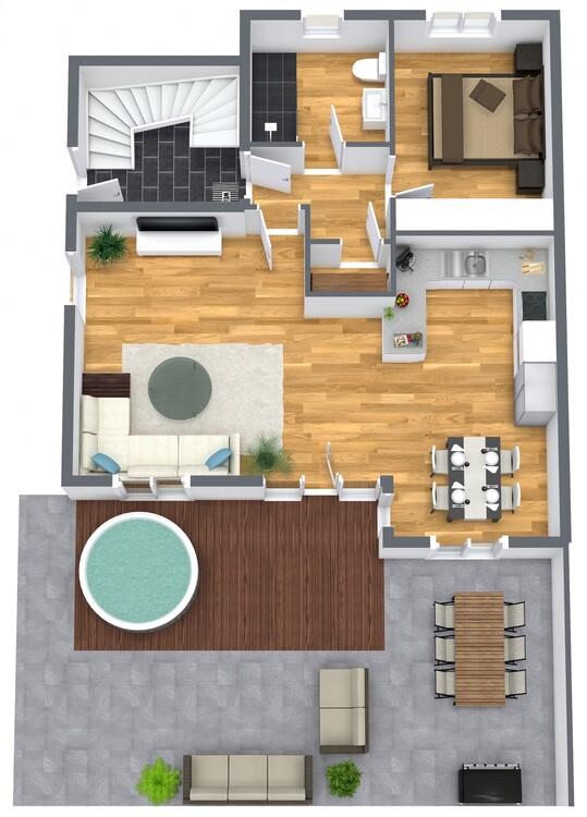 Im Obergeschoss liegen mehrere gemütliche Schlafzimmer sowie ein weiteres, großzügiges Bad mit Badewanne, bodentiefer Dusche und Fenster. Das Dachstudio auf der dritten Ebene bietet vielseitige Nutzungsmöglichkeiten – ob als Arbeitszimmer, Gäste- oder Hobbyraum.
