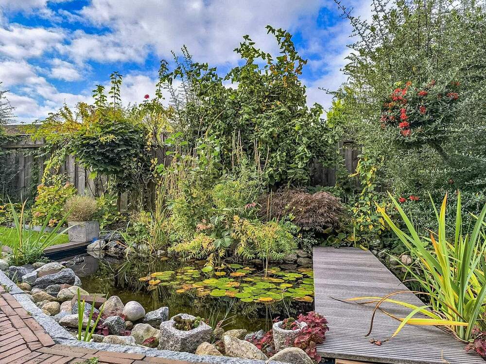 • Terrasse mit Gartenteich & elektrischer Markise -