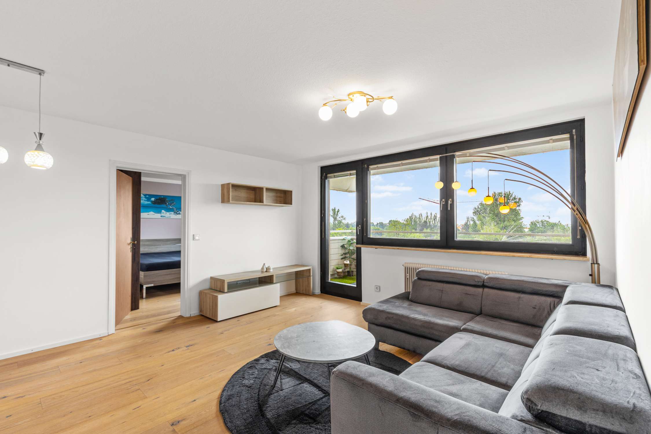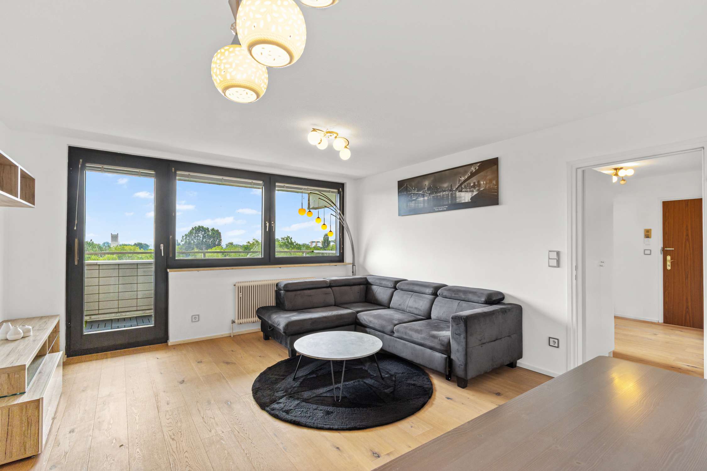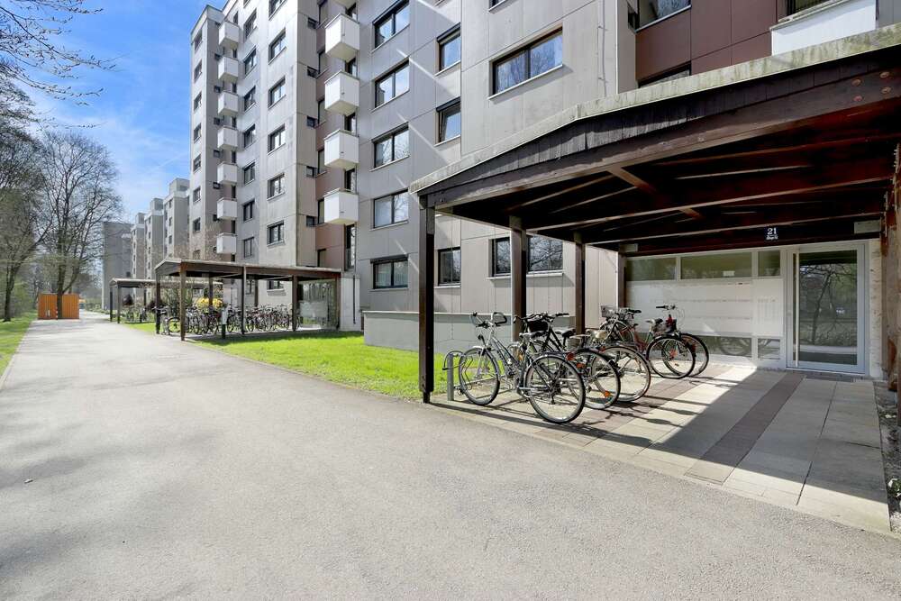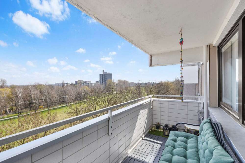 Mit großer Fensterfront zum überdachten Balkon hin wirkt der Wohnbereich hell und einladend und bietet Platz für ein gemütliches Sofa mit Beistelltisch, TV-Regal und einen kleinen Essbereich mit Schrank und Kommode für Ihr Hab und Gut. Der Balkon bietet einen tollen Weitblick aus dem 7.OG über Puchheim und auf die benachbarten Felder und Parks. Ein großes Kellerabteil (mit Fenster) bietet zusätzlichen Stauraum.