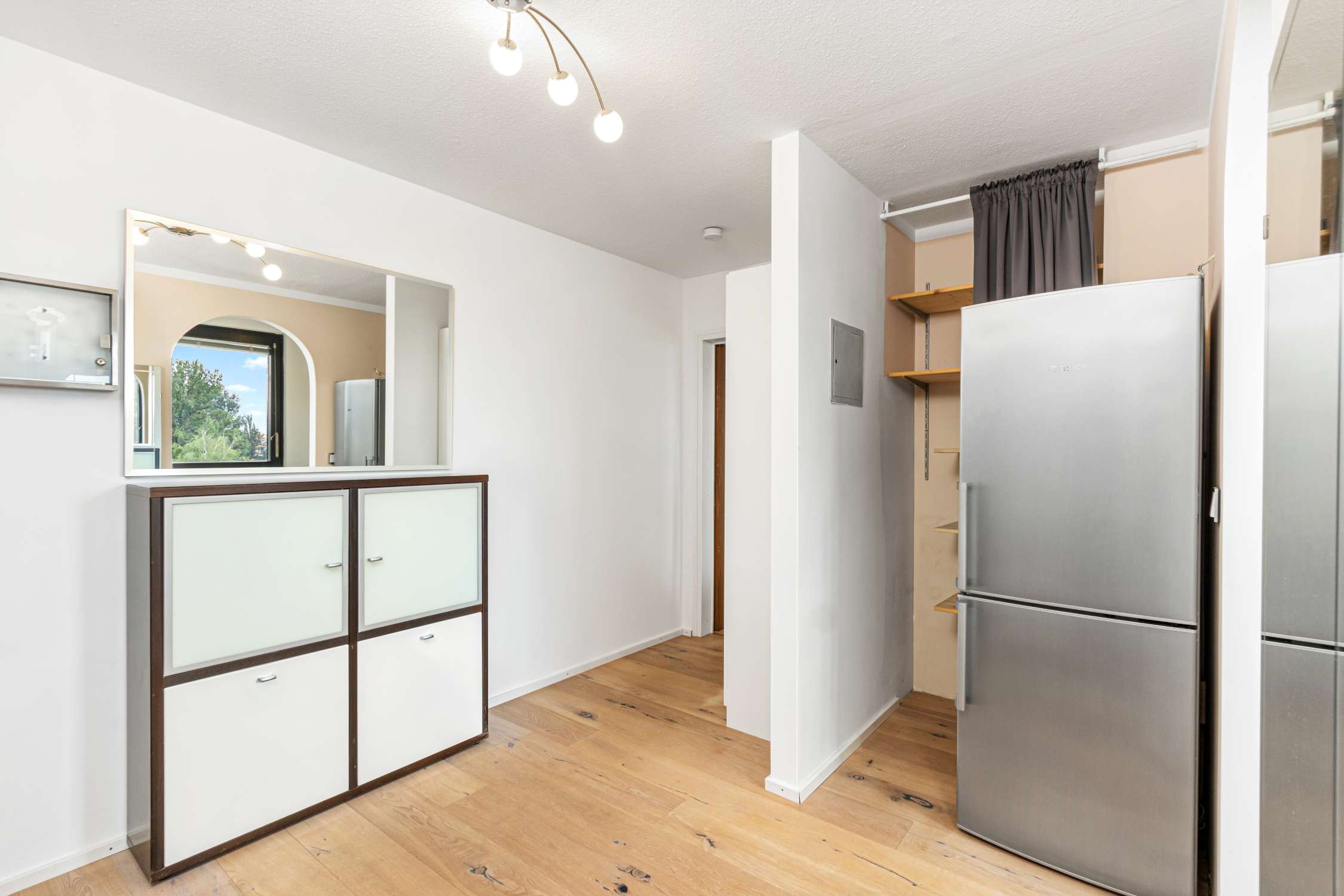 Ein freundlicher Eingangsbereich bietet Platz für Ihre Garderobe (Schuhschrank inklusive) und beheimatet einen großen Kühl-/Gefrierschrank am offenen Zugang zur kompakten Küche mit moderner, gepflegter Einbauküche inkl. Markengeräten. Auch Sicherungen und Schalterprogramm wurden bereits vor einigen Jahren modernisiert.