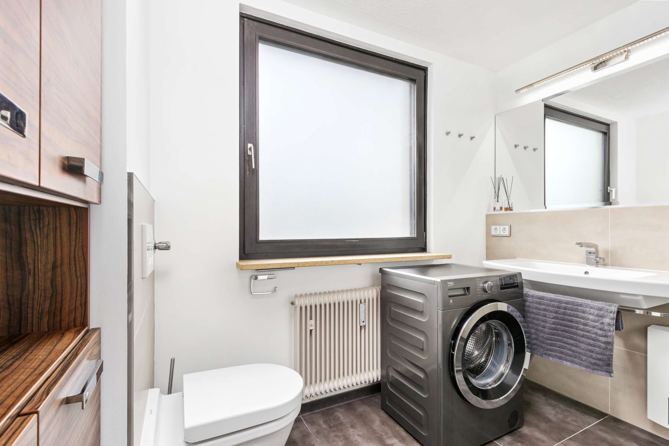 Das umfassend neu gestaltete Badezimmer ist dank großem Fenster schön hell und bietet neben einem wertvollen Waschmaschinenanschluss auch Stauraum mit praktischer Schranknische. Die große Walk-In-Dusche punktet mit Duschabtrennung in Glas, Rainshower-Duschkopf und modernen Armaturen. Auch an einen breiten Waschtisch mit integriertem Handtuchhalter und großen, beleuchteten Spiegel wurde bei der Modernisierung gedacht.