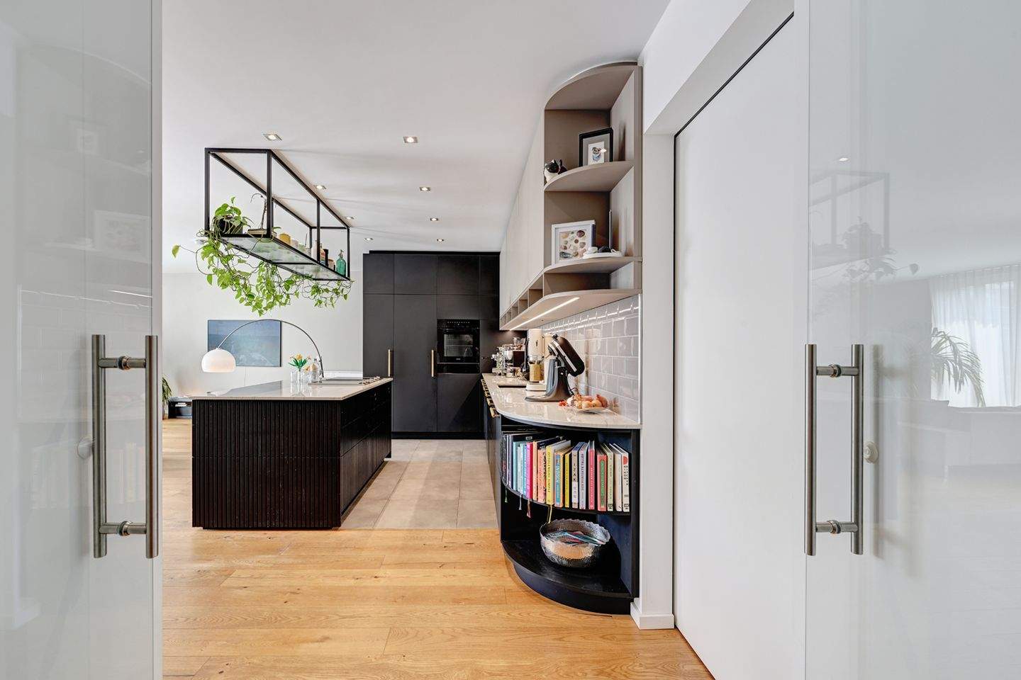 Einladend freie Sicht vom Flur in den Küchenbereich, elegant durch eine Glasflügeltüre verbunden - H&G - COMING HOME `25 - Familien-Luxusdomizil mit 4 Zi. im Herzen von Neuhausen