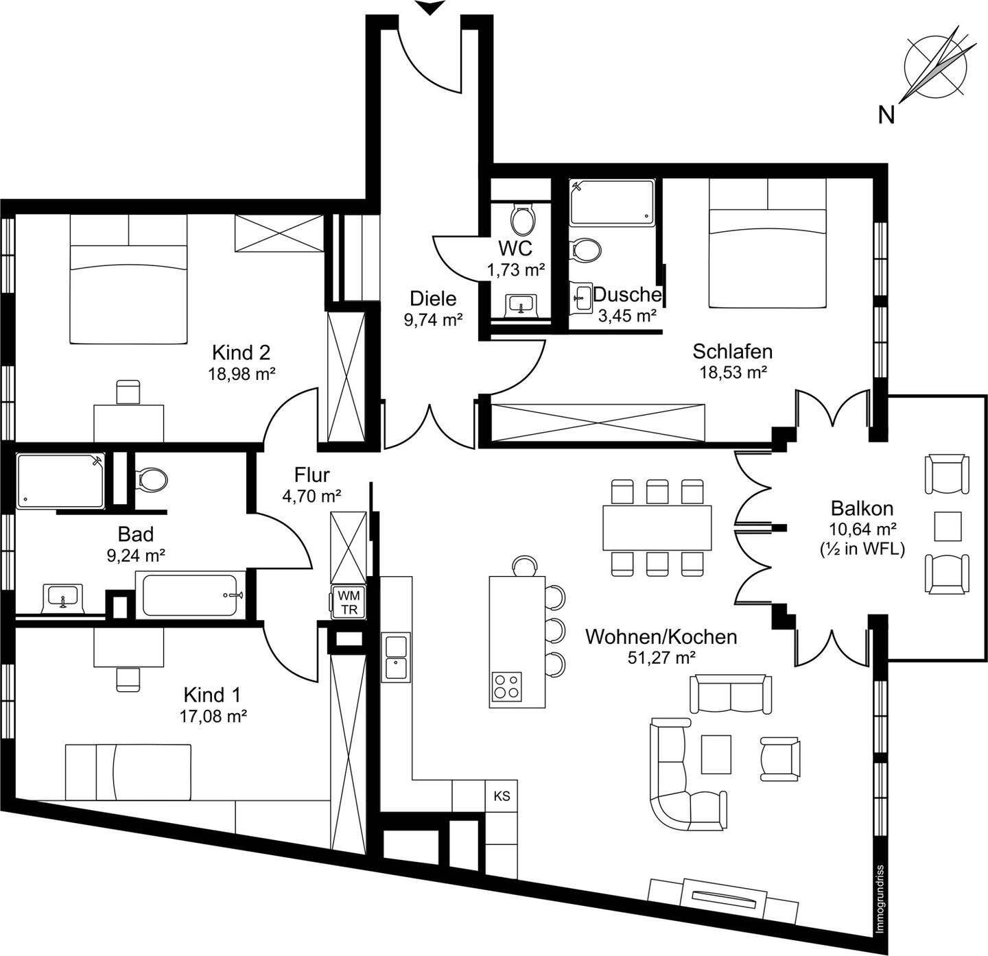 • Professionell geplantes Raumkonzept mit ca. 140,03qm WFL, Balkon zu 1/2 in die WFL eingerechnet -