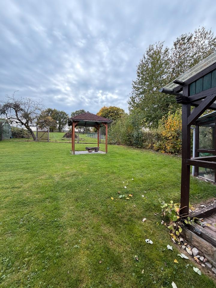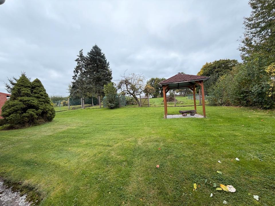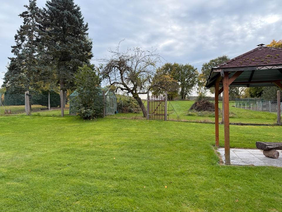 Wohnhaushälfte mit Nebengebäuden, Wiesen, Acker