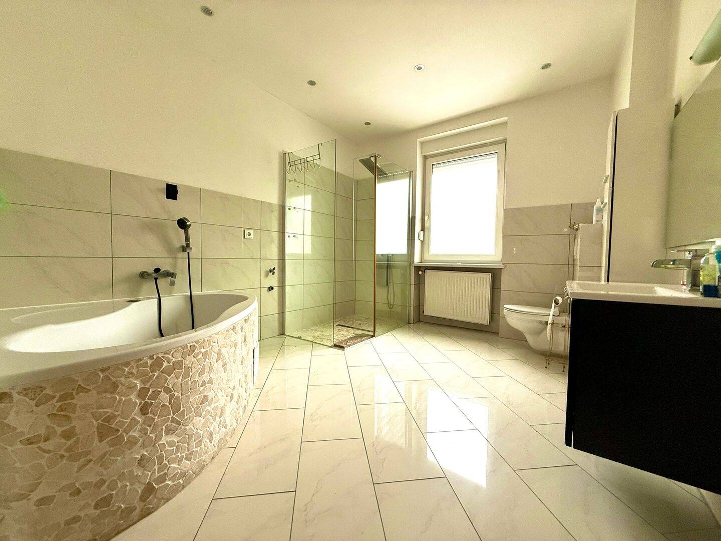 Die Wohnung wurde renoviert und hat einen gepflegten, hellen Fliesenboden in allen Wohnräumen außer den Schlafzimmern. In den beiden Schlafzimmern liegt Laminatboden. Das Badezimmer ist saniert und hat eine Badewanne und eine Dusche.