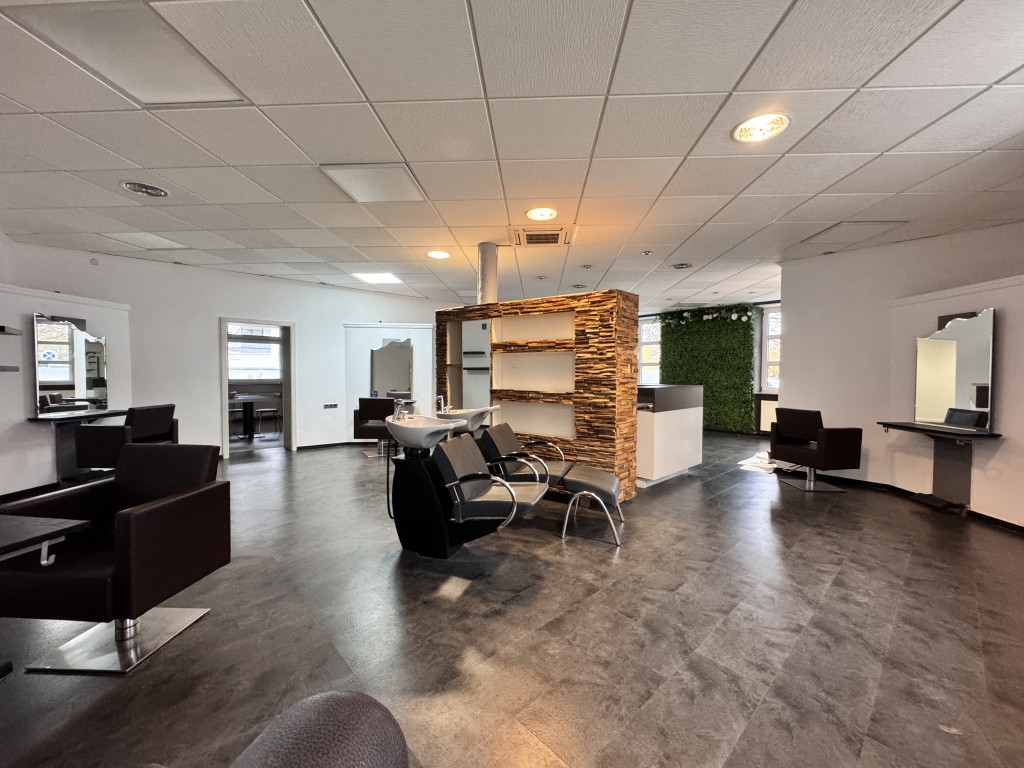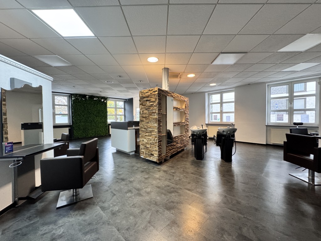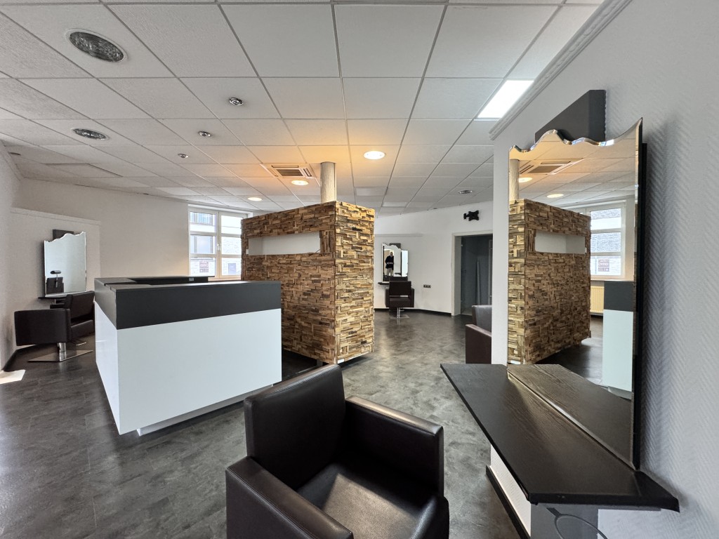 Der derzeit als Friseursalon genutzte Bereich überzeugt durch seine offene, lichtdurchflutete Raumaufteilung, die sich bei Bedarf flexibel in einzelne Praxis- oder Büroräume unterteilen lässt. Auf Wunsch kann die bestehende Saloneinrichtung gegen Abstand übernommen werden. Diese umfasst mehrere Arbeitsplätze mit hydraulisch verstellbaren Bedienplätzen, Waschplätze, eine Empfangs- und Produkttheke, eine Küche mit Aufenthaltsraum, ein WC sowie einen Abstellraum. Ein separater, ca. 20, 5 m² großer Raum ist durch einen breiten Durchgang optisch abgetrennt und eignet sich hervorragend als Kosmetik- oder Nagelstudio oder kann vollständig abgeteilt werden.
