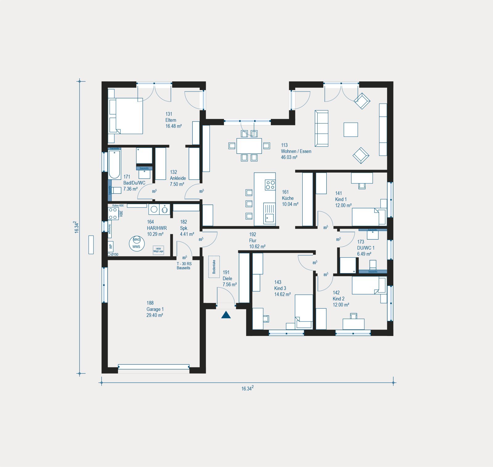 Für modernen Wohnkomfort sorgen eine energieeffiziente Luft-Wasser-Wärmepumpe, eine kontrollierte Be- und Entlüftungsanlage mit Wärmerückgewinnung sowie unser durchdachtes Heizungs- und Elektropaket. Auch die Haustechnik inklusive Rohrleitungen ist bereits vollständig enthalten.