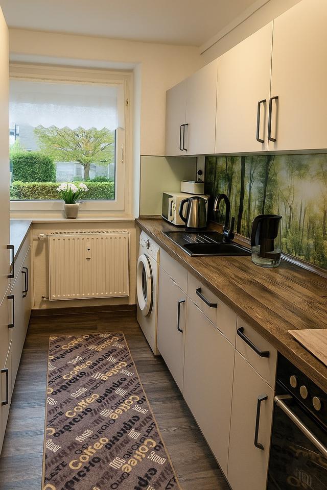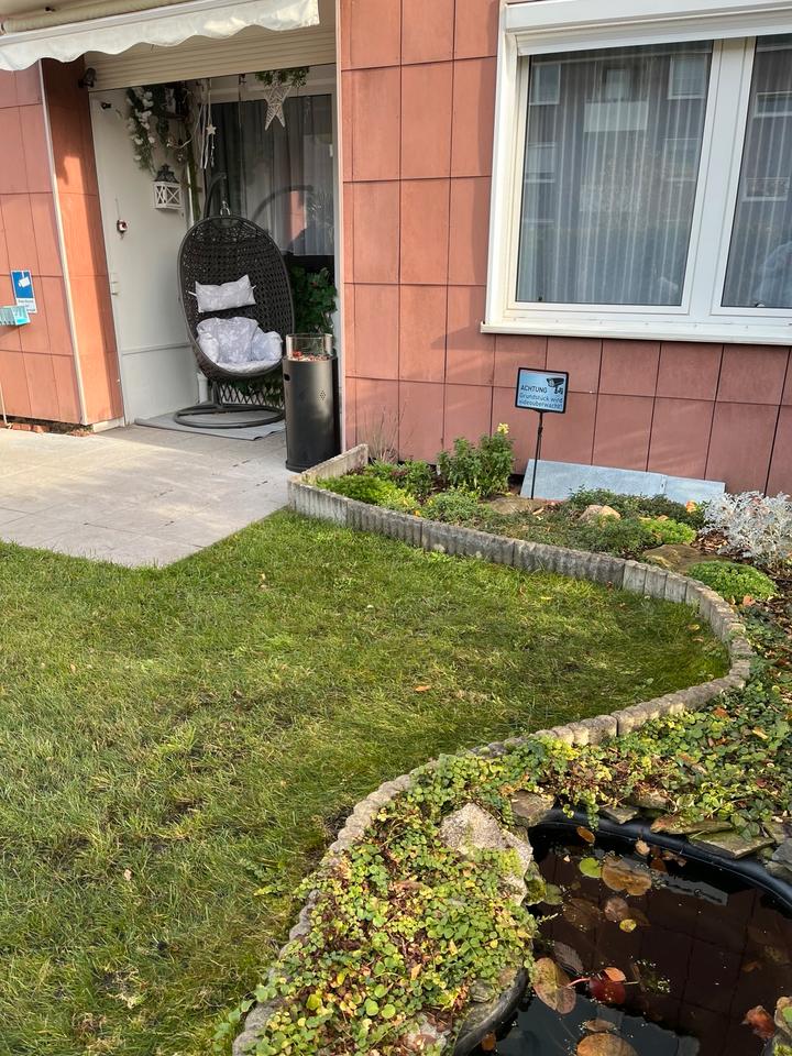 Drei Zimmer, Eigentumswohnung, Hochparterre mit Garten und Garage