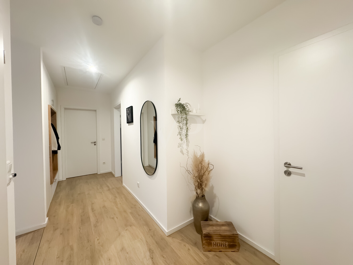Sie betreten die Immobilie über einen gemeinsamen Eingangsbereich. Eingetreten befinden Sie sich im großzügigen Flurbereich mit eingebauter Garderobe wieder. Von hieraus können Sie alle Räumlichkeiten der Wohnung betreten. Es stehen Ihnen als Mieter zwei Schlafzimmer und ein offener Wohn- und Essbereich mit Einbauküche zur Verfügung. Das Badezimmer, mit ebenerdiger Dusche, wurde voll gefliest und mit wertigen Armaturen ausgestattet. Ein Abstellraum mit Anschlüssen für den Trockner und Waschmaschine darf hier natürlich nicht fehlen. Die Räumlichkeiten sind mit einem Designboden in Holzoptik versehen. Alle Räumlichkeiten der Wohnung sind durch bodentiefe Fensterelemente lichtdurchflutet und es entsteht ein freundliches Wohnerlebnis, welches die hohen Erkerausbauten nochmal unterstrichen wird.