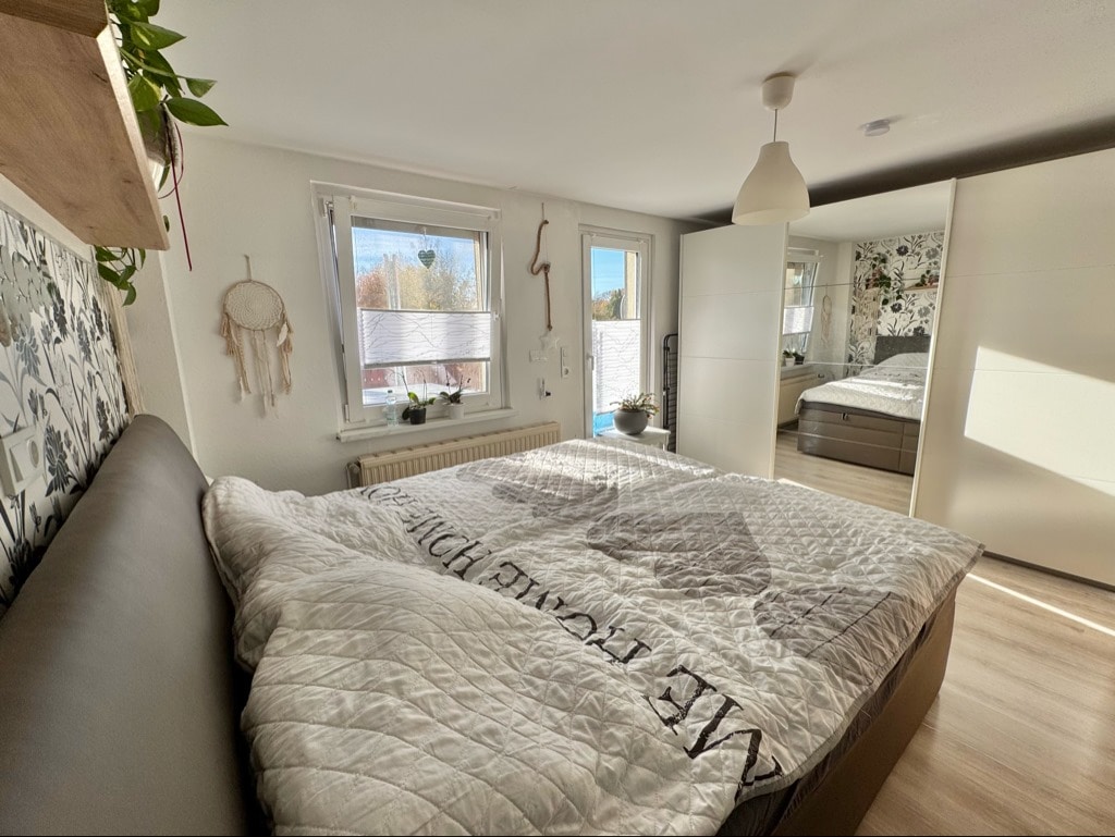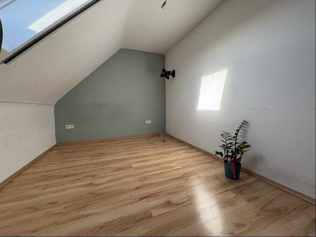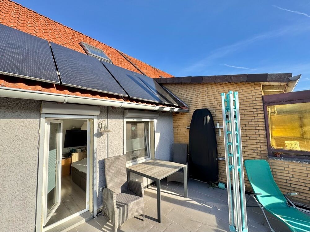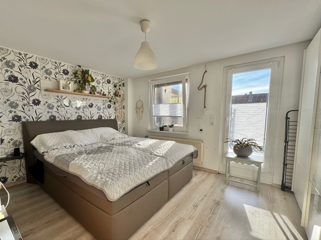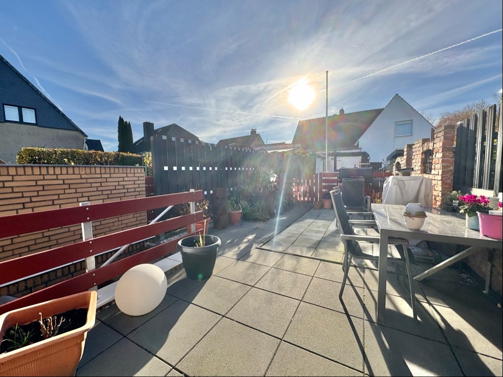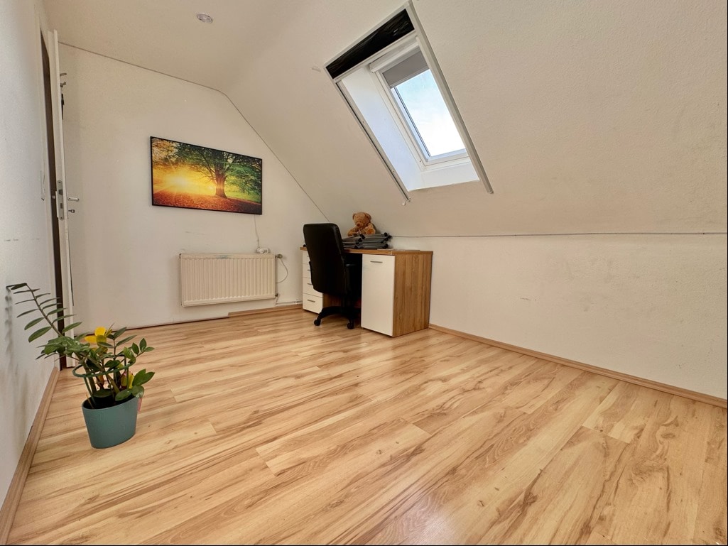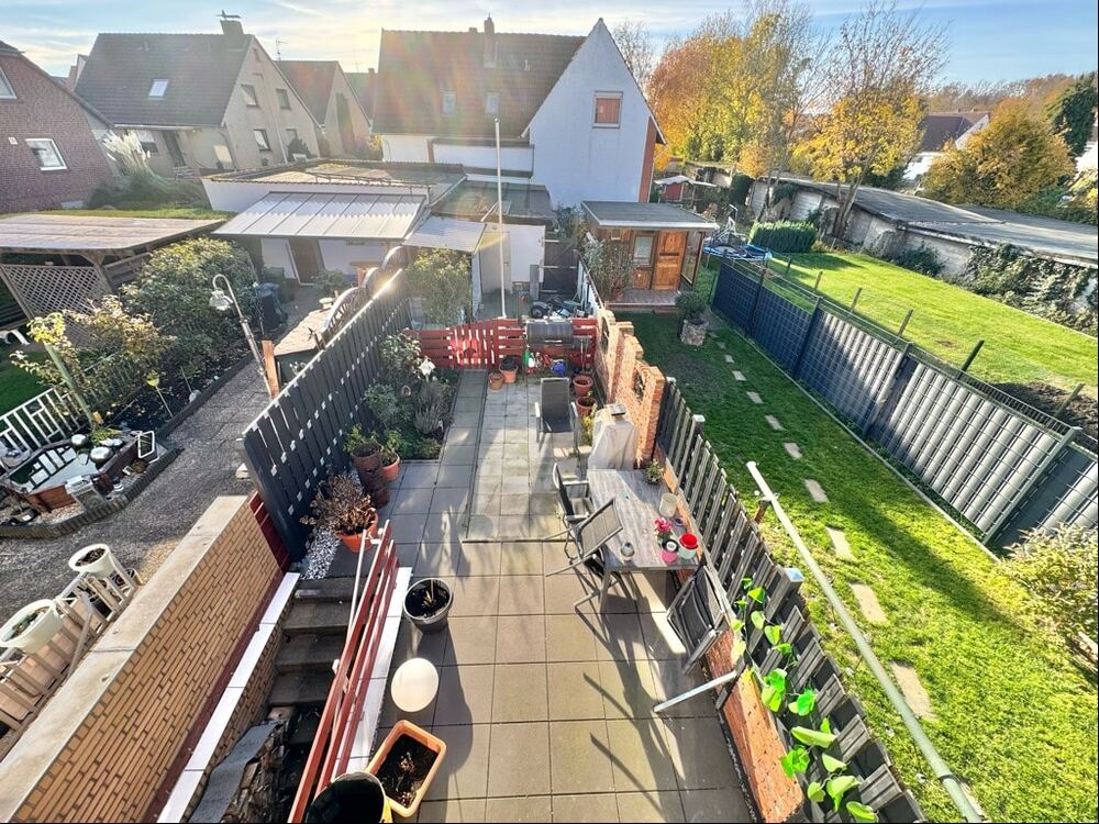 Beim Betreten des Hauses gelangt man vom Flur in den Wohnbereich und zur Treppe, die in das Obergeschoss führt. Das Herzstück des Hauses bildet das großzügige Wohnzimmer, welches Zugang zur sonnigen Terrasse und zum idyllischen Gartenbereich des ca. 187 m² großen Erbbaugrundstücks bietet. Vom Wohnzimmer aus erreicht man auch die angrenzende Küche inklusive Einbauküche (Baujahr 2018). Im Obergeschoss erwartet Sie ein komfortables Schlafzimmer mit Zugang zu einer Dachterrasse sowie ein modernes Tageslichtbad mit Dusche. Eine weitere Treppe führt in das ausgebaute Dachgeschoss, welches als Kinderzimmer, Gästezimmer oder Bürozimmer genutzt werden kann.