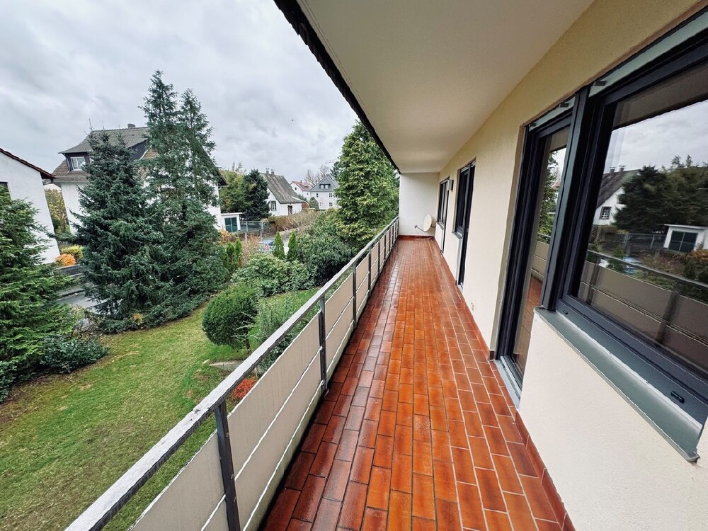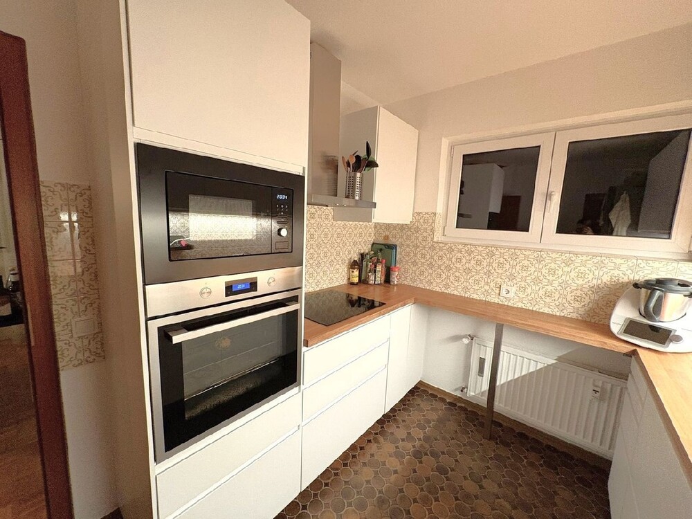Eingangsbereich: neue, 3-fach verglaste Etagentüren. Flur: großzügig geschnitten mit Einbauschrank. Wohnzimmer: mit integrierten Essbereich und direkten Zugang in die geräumige Küche und Zugang zum Balkon. Balkon: ca. 20m², überdacht, Süd-West-Lage, Blick in den Garten und alten Baumbestand. 3 Schlafzimmer: zwei davon mit direktem Zugang zum Balkon. Küche: hier ist eine 1 Jahr junge EBK bereits vorhanden, die vom jetzigen Mieter gegen eine Abstandszahlung von EUR 7.500, 00 VHB incl. Garantie übernommen werden kann. Die Küche selbst ist ausgestattet mit einem schönen dunklen Fliesenboden und Fliesenspiegel hellbeige, grau (Floral Retro). Badezimmer und Gäste-WC: beide mit Fenster, luxuriöse Ausstattung mit namhaften Armaturen und formschönen Objekten, Dusche bodeneben mit Glastrennwand, Doppelwaschbecken/Waschbecken (Gäste-WC) mit funktionellen Unterschrank und großen Spiegelschrank mit Lichtkonzept. Garten: zur Mitnutzung des gepflegten und hübsch bepflanzten Gartens, der zum Verweilen einlädt. Kellergeschoss: frisch renoviert, größtenteils gefliest mit großformatigen, hellen Fliesen passend zur Travertintreppe, Wasch- und Trockenraum zur Allgemeinnutzung und ein eigener, beheizter Hobbyraum mit Tageslicht zur Alleinnutzung. Garage, Stellplatz und Fahrrad-Stellplatz: Garage mit automatischem Schwingtor, Stellplatz davor und Fahrrad-Stellplätze im eingezäunten Bereich vor der Haustüre. Die Außenfassade wurde energetisch aufgearbeitet und das Haus ist komplett erneuert und wärmegedämmt.