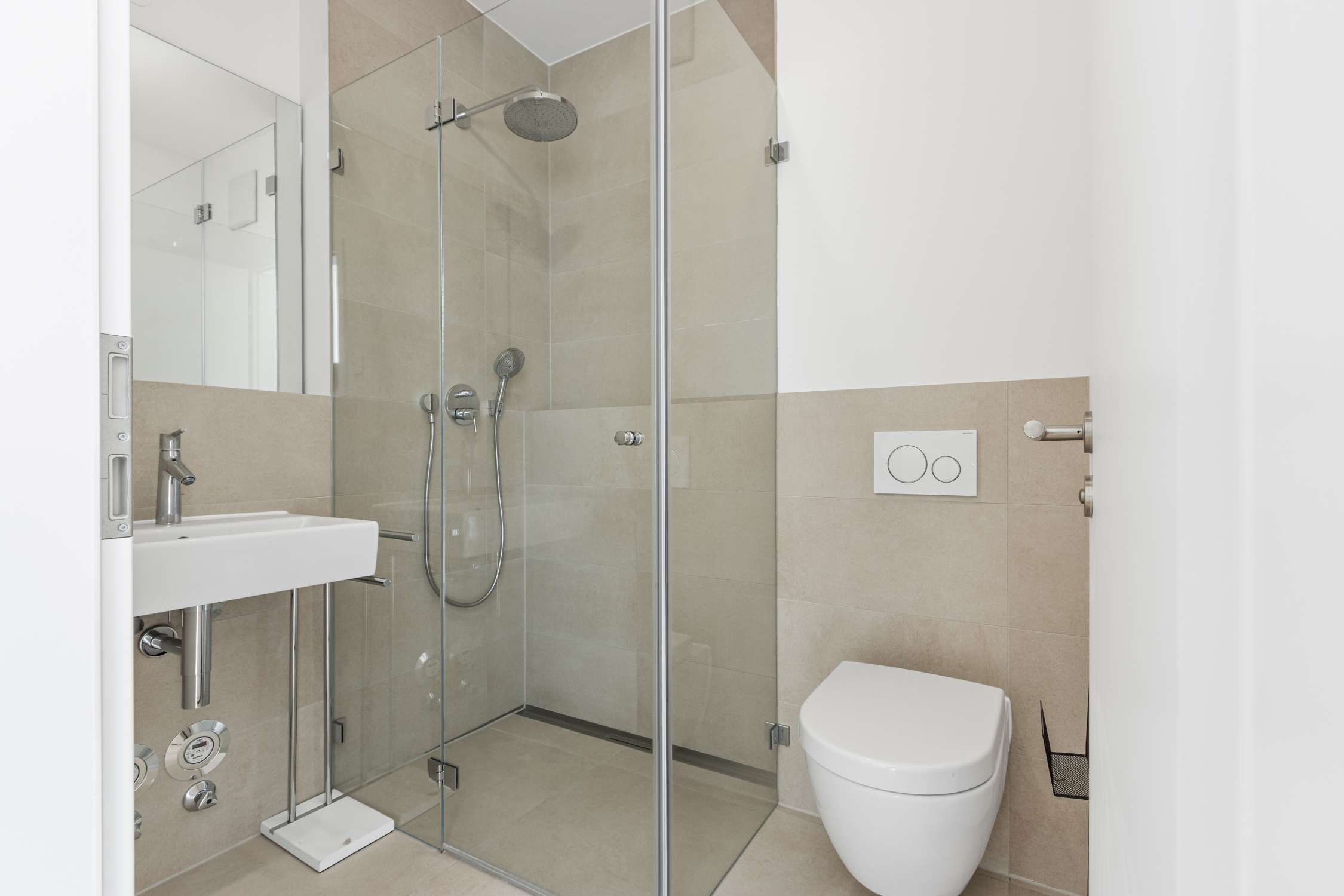 Völlig selbstredend wurde die Innenausstattung im Baujahr 2020 modern gewählt: Parkettböden, zeitlose Fliesen in gleich zwei Bädern und bodentiefe Fenster mit elektr. Rollläden zählen hier selbstverständlich zum Standard.