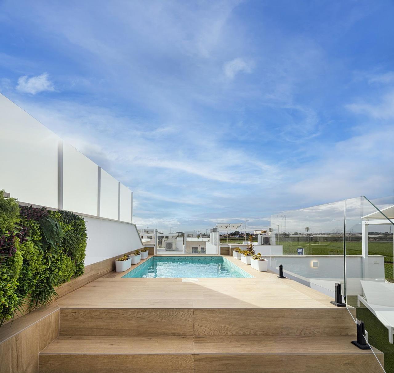 Alle Immobilien haben 3 Schlafzimmer, 2 Bäder, offene Küche mit Wohnbereich, Einbauschränke und Terrasse. Alle Eigenschaften hat private Gärten und Parkplatz. Plus Bungalows auf der obersten Etage hat private Sonnenterrasse.