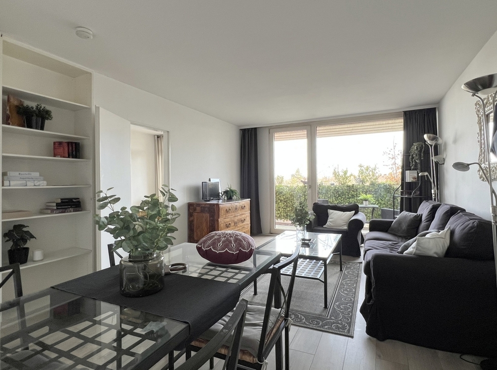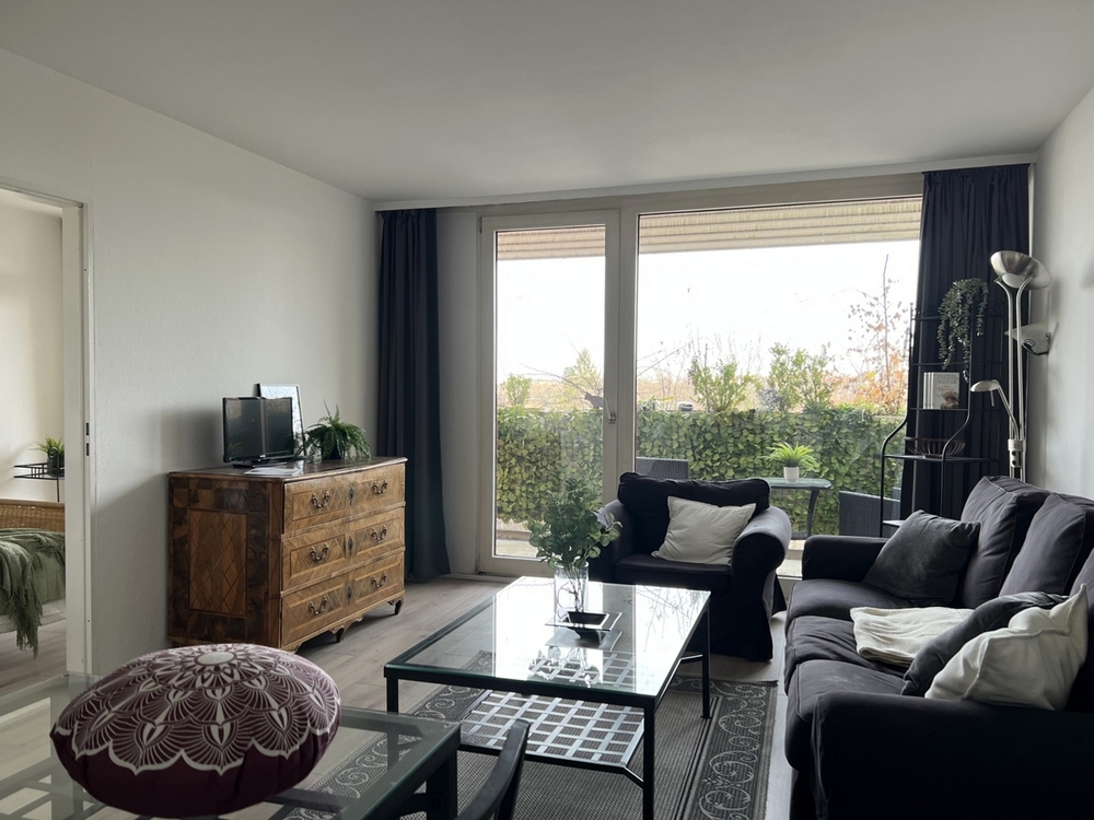 Raumaufteilung: - Eingangsflur mit Nische für eine Garderobe - saniertes Badezimmer mit Wanne, WC, Waschbecken, Spiegel - Küche, ausgestattet mit Herd, Ceranfeld, Spülmaschine und Kühlschrank - Das Herzstück der Wohnung ist das helle Wohn/Esszimmer mit Couch, Glas-Esstisch mit Stühlen, Regal und antiker Kommode. - Schlafzimmer mit Zugang zur Terrasse - Ankleidebereich mit beidseitigen Schränken - große durchgehende Terrasse, die vom Wohnzimmer und Schlafzimmer aus zugänglich ist - Kellerabteil