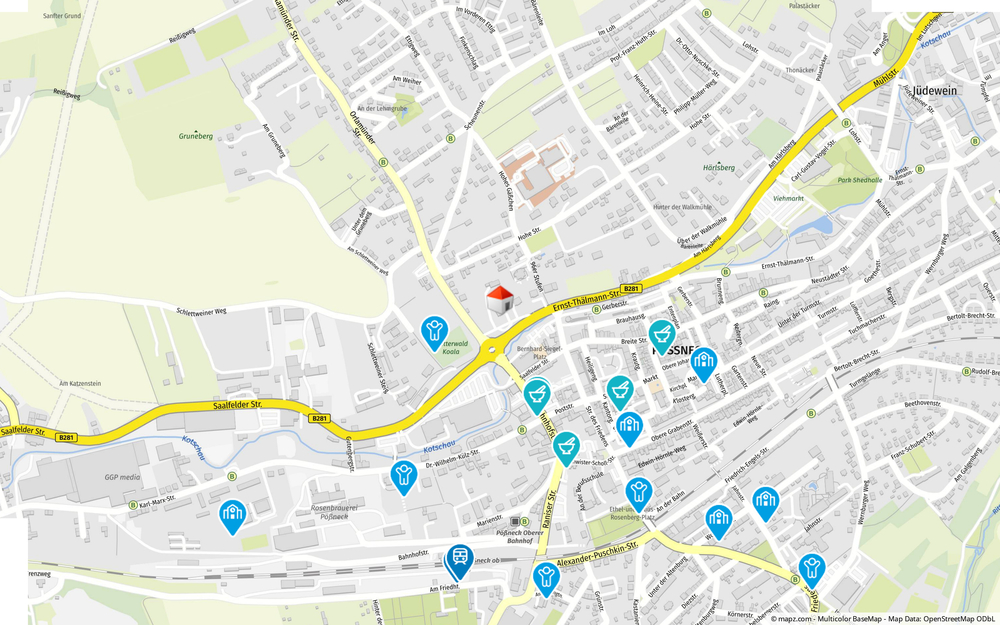 Ein Viertel mit Stil und Geschichte Das Wohnviertel rund um die Ernst-Thälmann-Straße ist geprägt von eleganten Ein- und Zweifamilienhäusern sowie denkmalgeschützten Villen, was dem Umfeld ein gehobenes, charmantes Flair verleiht. Die Innenstadt von Pößneck mit weiteren Einkaufsmöglichkeiten, Apotheken, Cafés und Dienstleistungsangeboten erreichen Sie ebenfalls schnell zu Fuß oder mit dem Fahrrad.