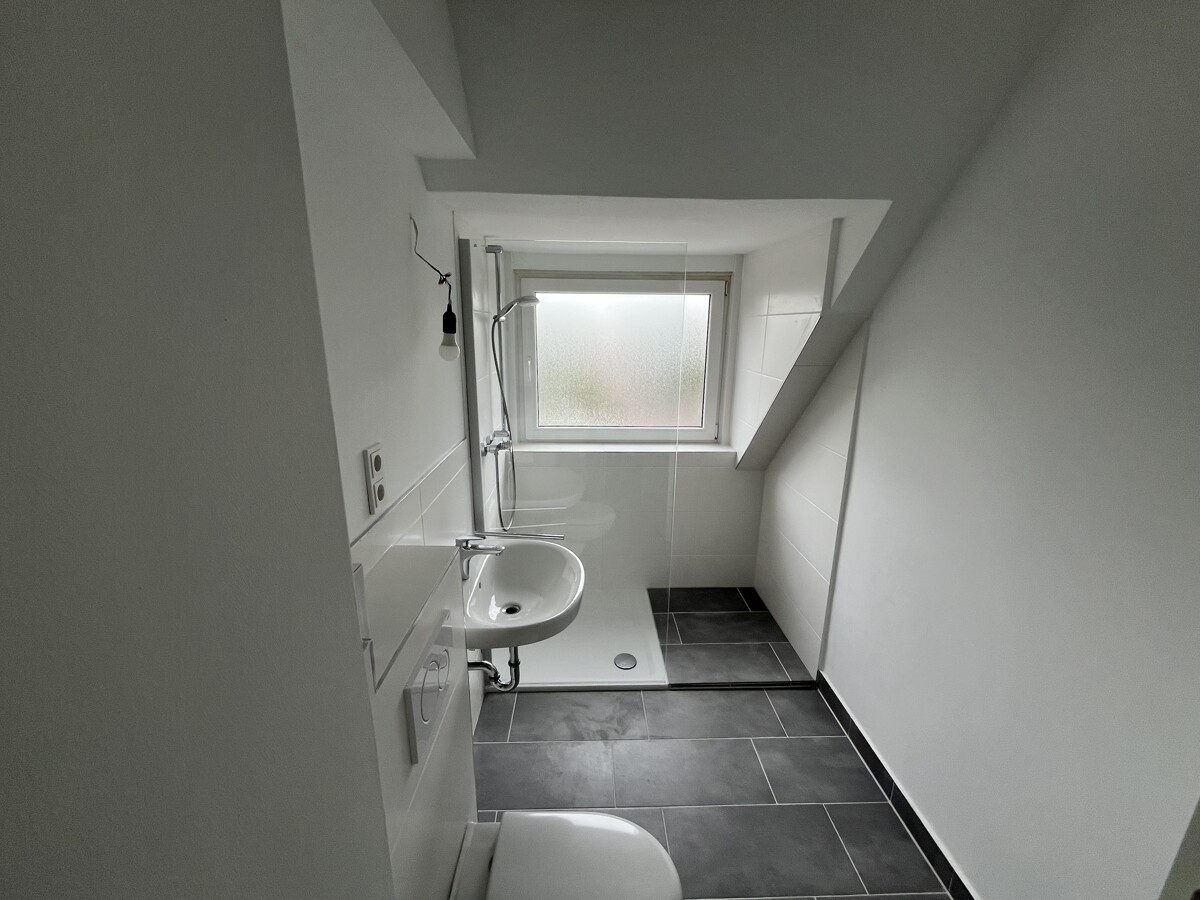 Die Tageslichtbäder sind modern gestaltet: weiße Wandfliesen verleihen Helligkeit, während anthrazitfarbene Bodenfliesen einen eleganten Kontrast schaffen. Zur Ausstattung gehören eine Dusche mit flacher Duschtasse sowie ein WC. Durch das vorhandene Fenster wird das Bad optimal belichtet und gut belüftet.