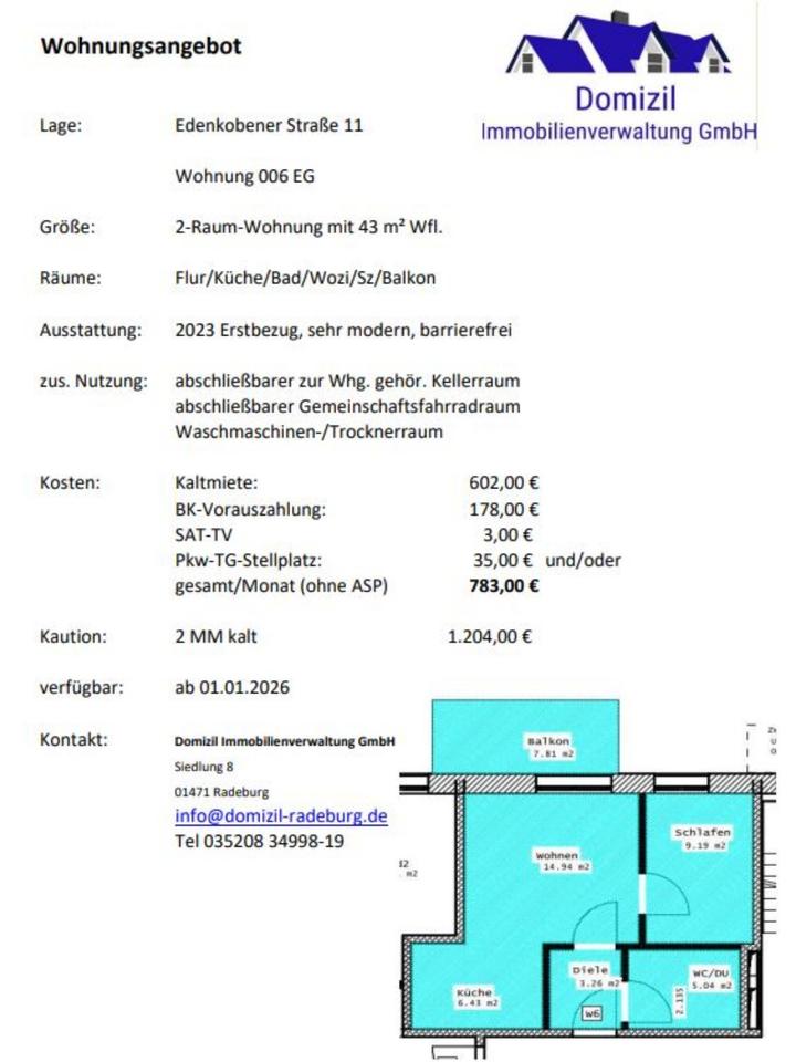 Sie befinden sich hier: 2 Raumwohnung mit EBK und Balkon (42m²) in Radeburg in Radeburg - 3269618078-203-3991 | 1A-Immobilienmarkt.de