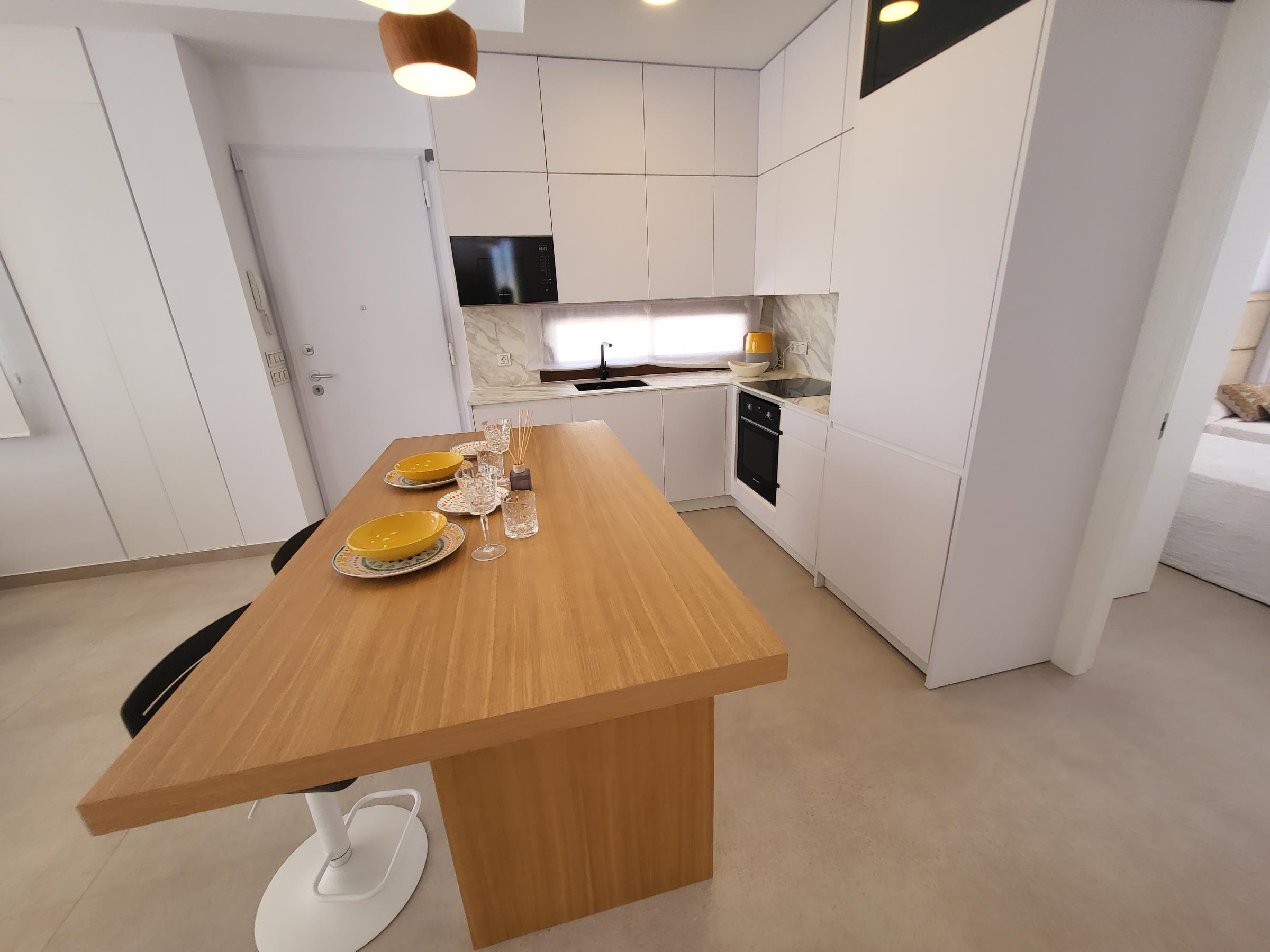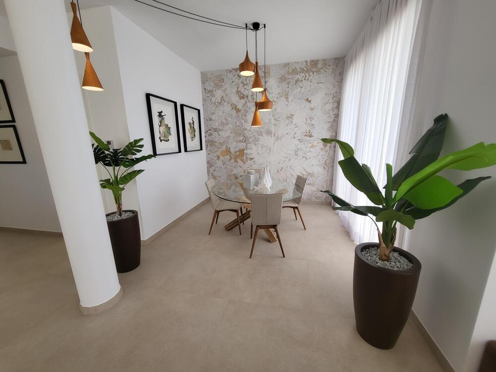 Alle Einrichtungsgegenstände sind von hohem Standard mit Silestone-Arbeitsplatten in der Küche, Climalit-Doppelverglasung, Ladestation für Elektroautos, Einbauschränken mit LED-Beleuchtung, Vorinstallation für Klimaanlage im gesamten Gebäude und gefliester Porzellanterrasse.