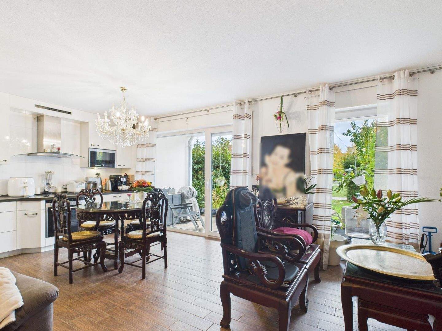 Offener Küchen/Wohn/Essbereich mit Blick in den Garten - Charmante Erbpacht-Terrassenwohnung in beliebter Wohngegend