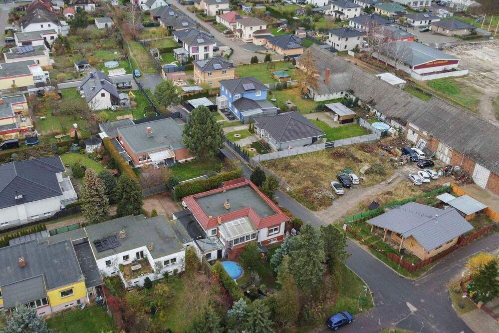 • Luftbild Haus und Garten - Ruhiges Familienidyll mit Wintergarten, Pool, Kamin, Garage & großem Potenzial in Markendorf