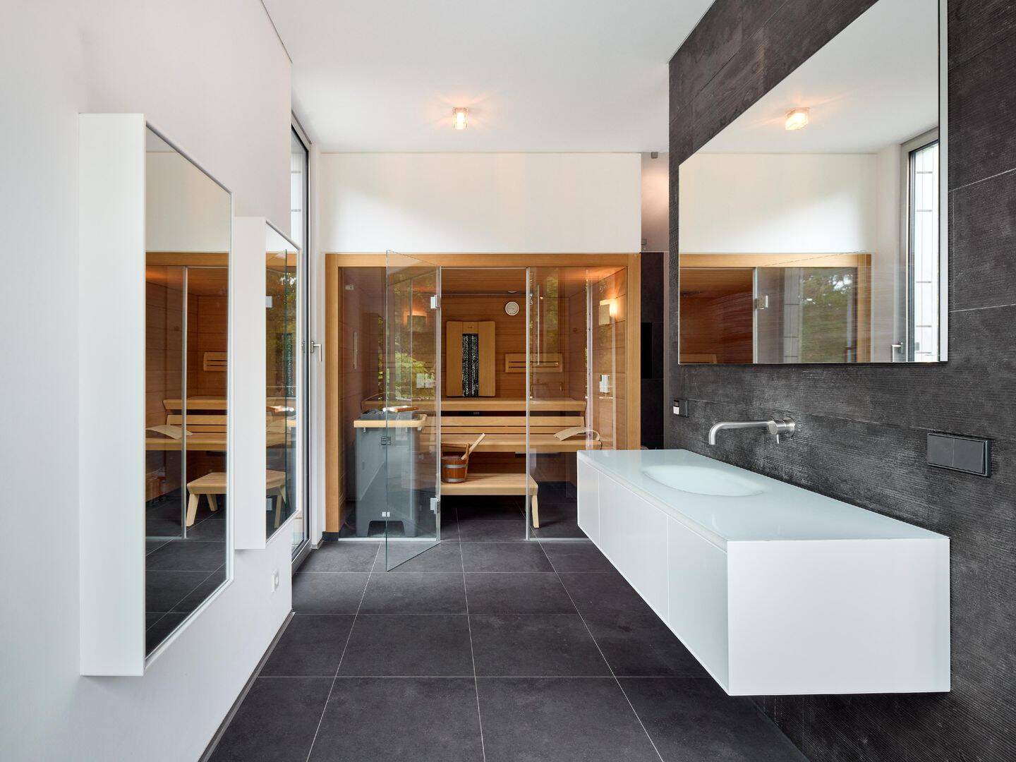• Das Master-Bad im Staffelgeschoss präsentiert sich mit allem Komfort wie der integrierten Sauna -