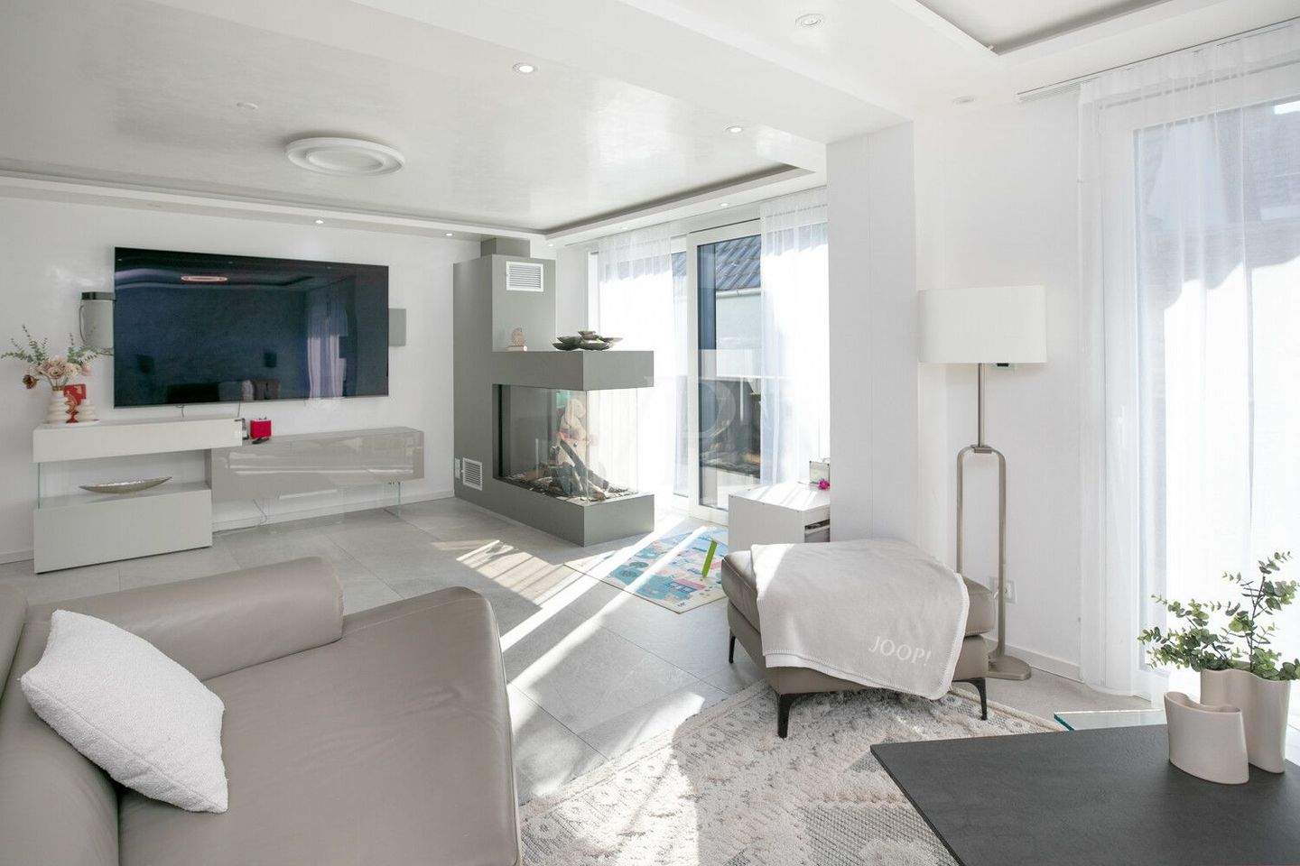 • Wohnbereich mit Kamin und Balkon -