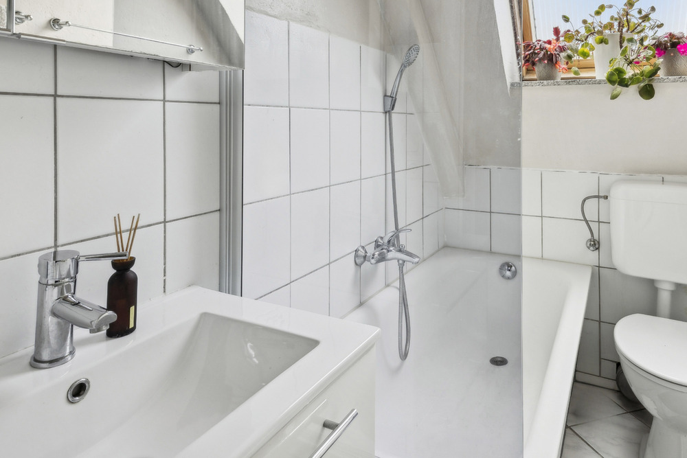 Badezimmer mit Wanne und Fenster -