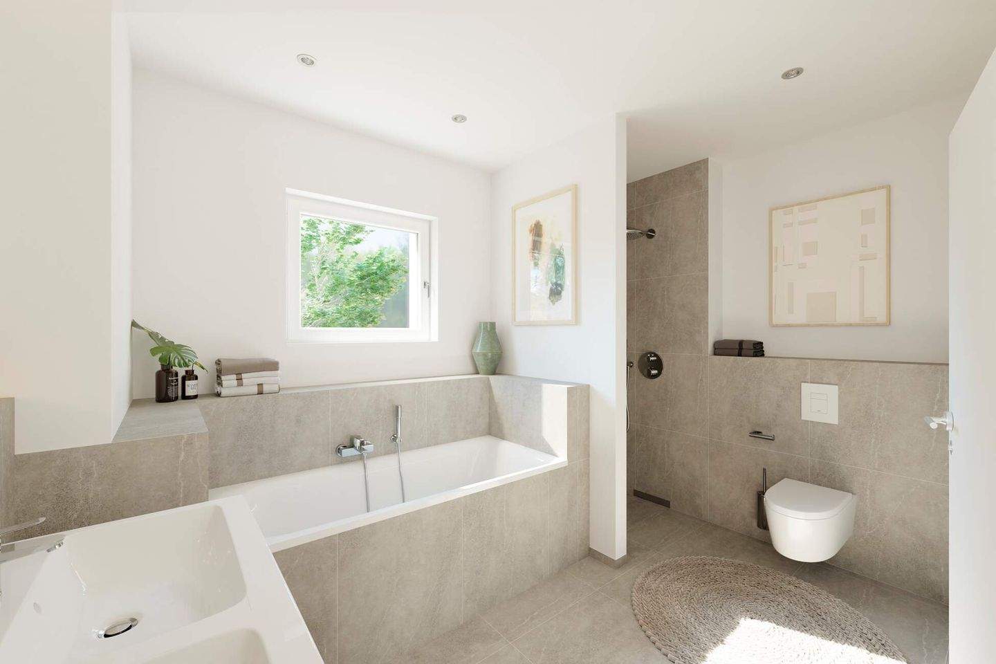• Modern gefliestes Tageslichtbad mit Badewanne im Obergeschoss -
