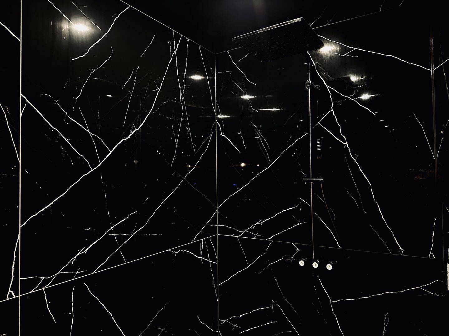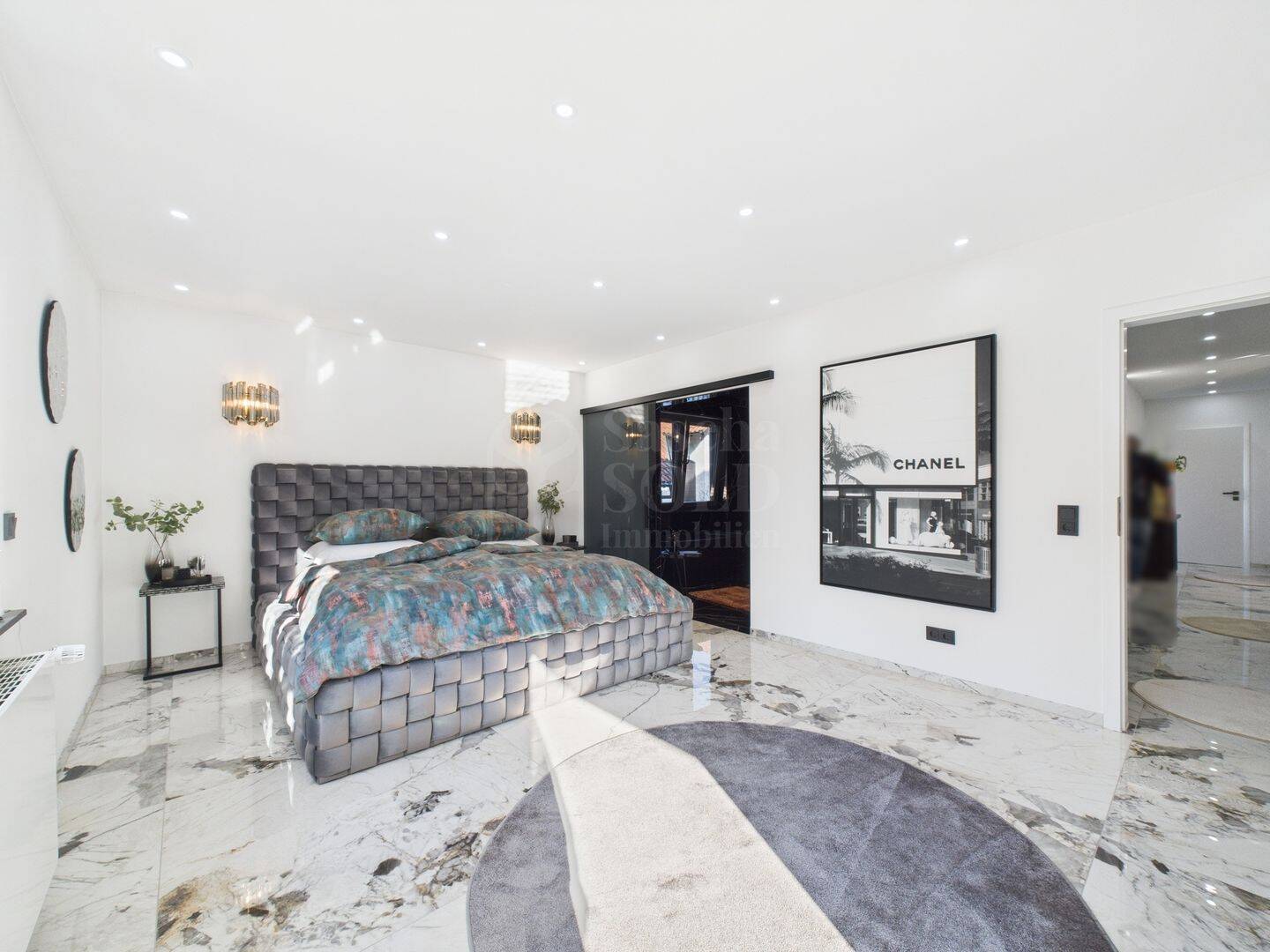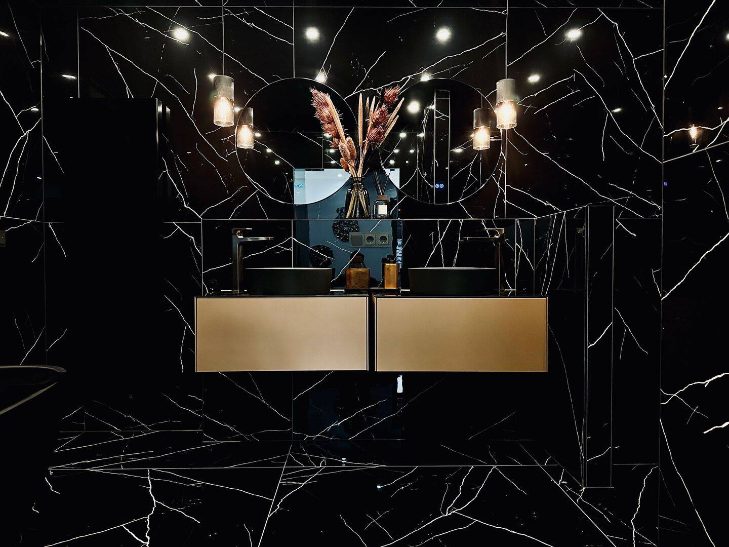Das luxuriöse en Suite Bad beinhaltet eine freistehende Badewanne, eine begehbare Dusche, eine Toilette und zwei Waschbecken. Edle schwarze Großformatfliesen zieren sowohl den Boden als auch die Wände, was dem Raum eine exklusive Atmosphäre verleiht. Zusätzlich verfügt die Wohnung über ein separates Gäste-WC mit Toilette und Waschbecken.