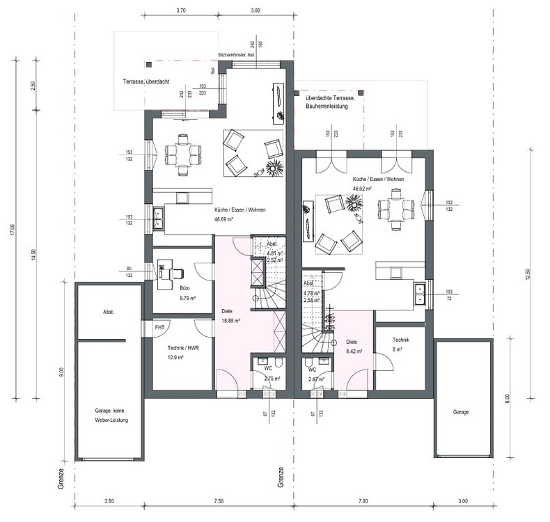 Variante 1 Haus links: ca. 194 m² Wfl., ca. EUR 630.000.– schlüsselfertig, ohne Garage, zzgl. Grundstück (diese Seite & Variante hat sich bereits unser Kunde ausgesucht) Variante 2 Haus rechts: ca. 135 m² Wfl., ca. EUR 450.000.– schlüsselfertig, ohne Garage, zzgl. Grundstück (Änderungen können mit Fertighausfirma besprochen werden)