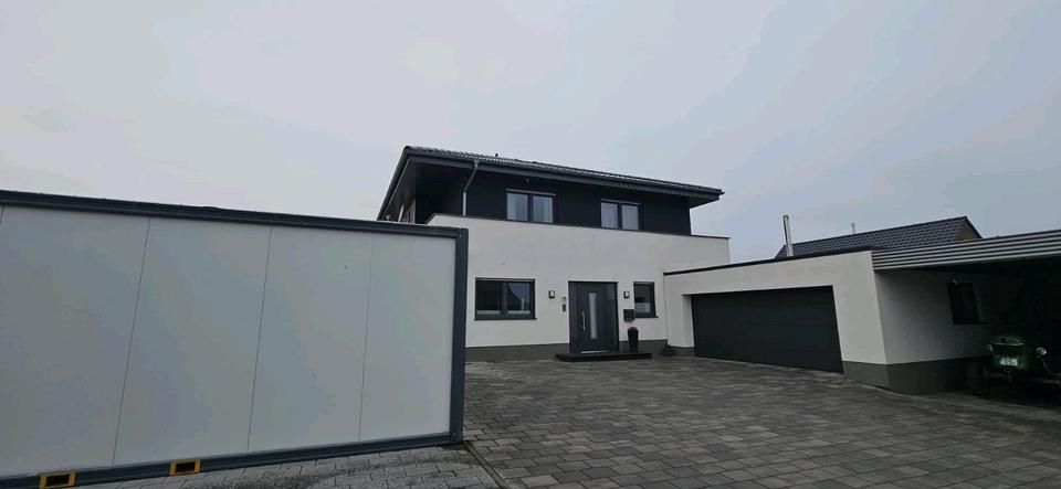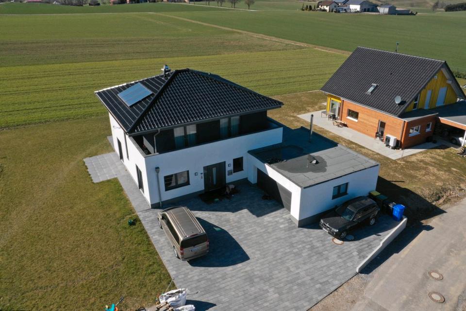 Einfamilienhaus mit Garage, Carport und großem Grundstück.