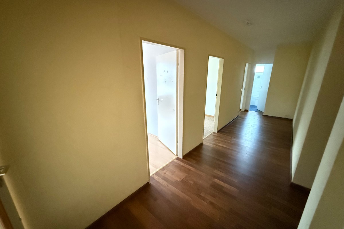 Es empfängt Sie die großflächige Diele, der sich sogleich die Küche mit Durchgang in das helle Wohnzimmer mit Zugang auf den Balkon anschließt. Dieser erstreckt sich über die gesamte Länge der Wohnung und kann von jedem der sich anschließenden 3 Schlafzimmer betreten werden. Ein Tageslicht-Dusch-/und Wannenbad rundet das Raumangebot ab.