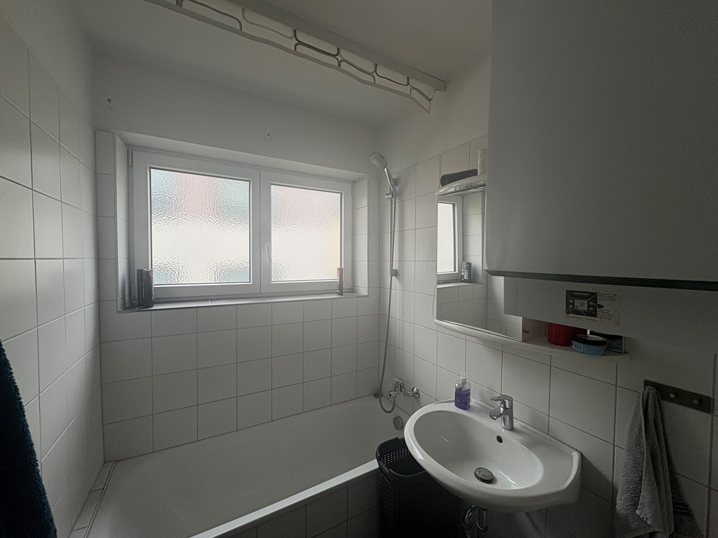 - Badezimmer raumhoch gefliest, ausgestattet mit Dusche & Wanne, Waschbecken, WC und Spiegelschrank
