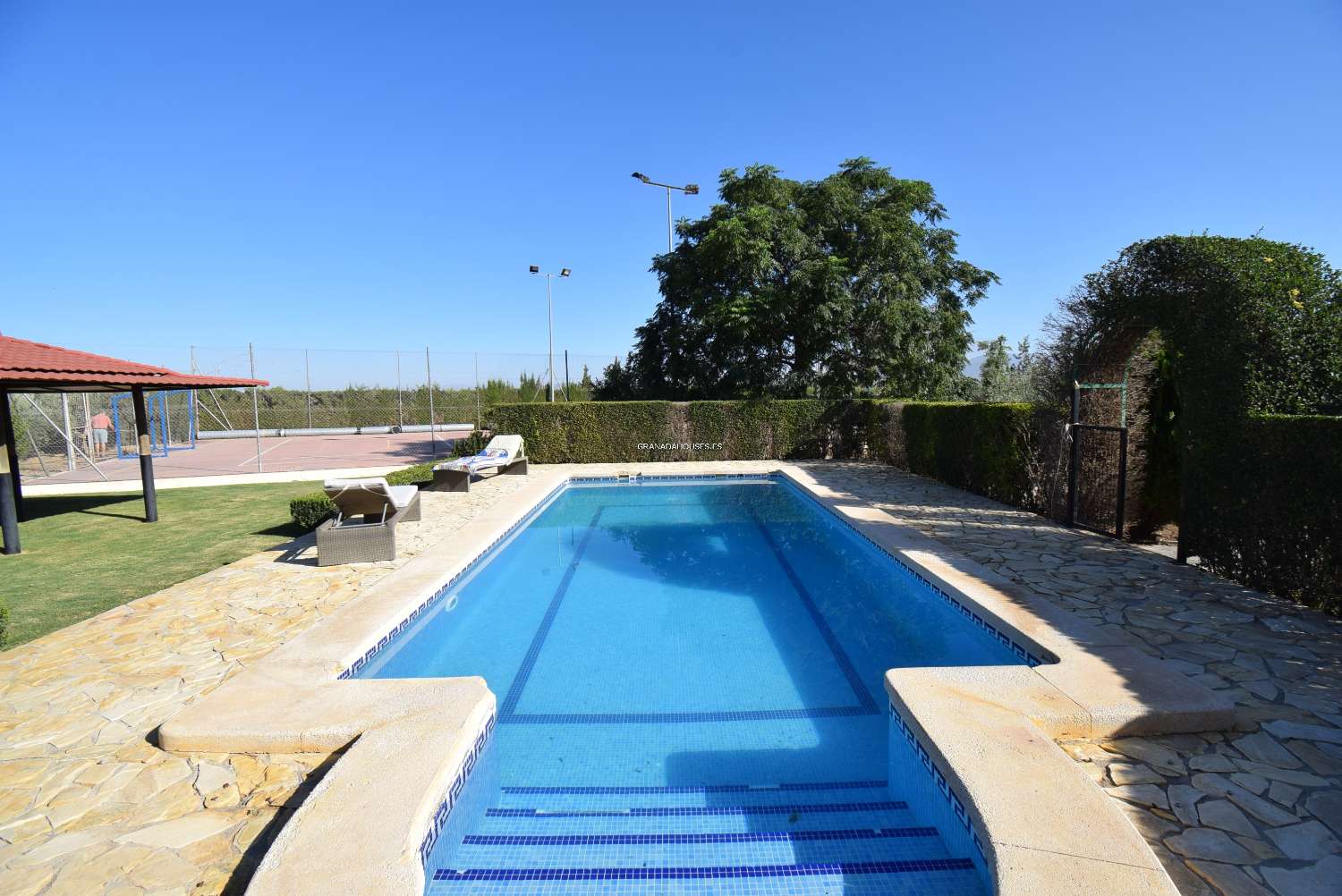 • Schwimmbad • Garage • Losgelöst • Garten • Tennisplätze/Basketball/5a-Fußballplatz • Hochwertige Verarbeitung • Stadtwasser und Strom • Einfacher Zugang zur Autobahn und zur Stadt Granada