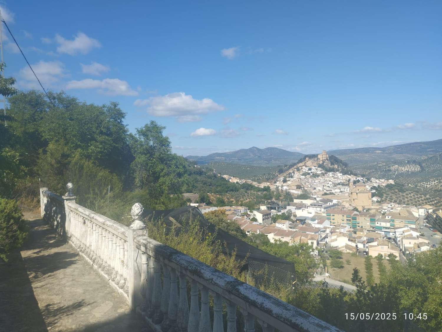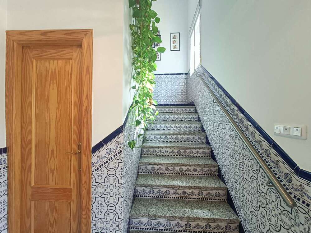 Der Flur ist wunderschön im andalusischen Stil gefliest und führt über eine Treppe ins Obergeschoss. Über einen weiteren Flur gelangt man in die voll ausgestattete Küche mit separatem Hauswirtschafts- und Vorratsraum. Ein großer Flurschrank bietet viel Stauraum. Am Ende des Flurs befindet sich das große Wohnzimmer mit direktem Zugang zu einer schönen, durchgehenden, überdachten Veranda und dem Garten. Im Erdgeschoss befinden sich außerdem ein Doppelzimmer und ein separates Duschbad. Durch eine weitere Tür gelangen Sie zu zwei weiteren Räumen: einem Zimmer mit Kamin und Zugang zum Garten und einem geräumigen Abstellraum. In diesem Bereich führen Stufen hinunter zur Doppelgarage. Im Obergeschoss befinden sich vier weitere Zimmer – zwei Doppel- und zwei Einzelzimmer – sowie ein Familienbadezimmer mit Badewanne. An beiden Seiten des Anwesens befinden sich lange Balkone, einer mit Blick auf einen Aussichtspunkt, der andere auf die Stadt und die beeindruckende Kirche auf dem Hügel. Der Garten ist sehr großzügig und ungestört, mit Zypressen, die auf beiden Seiten eine Hecke bilden. Zwei Bereiche sind bereits vorbereitet und können bepflanzt werden. Ein unterer Bereich mit einem Hühnerstall eignet sich ideal für einen oberirdischen Swimmingpool mit spektakulärem Blick über die Stadt und die Landschaft. Es besteht die Möglichkeit, hier eine separate Wohneinheit zur Vermietung zu errichten.
