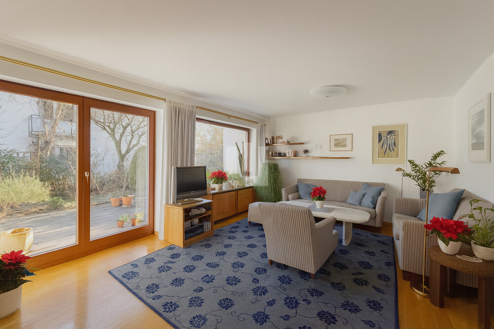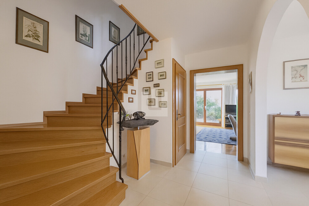 Erdgeschoss + Hochwertiger Fliesenboden mit Fußbodenheizung + Massive Echtholzküche + Zweifach verglaste Teakholzfenster + Kachelofen (Grundofen) im Wohnzimmer + Edler Parkettboden im gesamten Wohnhaus + Individuell gefertigter Flur mit Garderobe, Schuhschrank und Schreiner-Einbauten + Zeitloses Gäste-WC, raumhoch gefliest + Stilvolle Holzeingangstüre mit Glaselement + Großzügige Terrasse mit direktem Zugang zum Garten