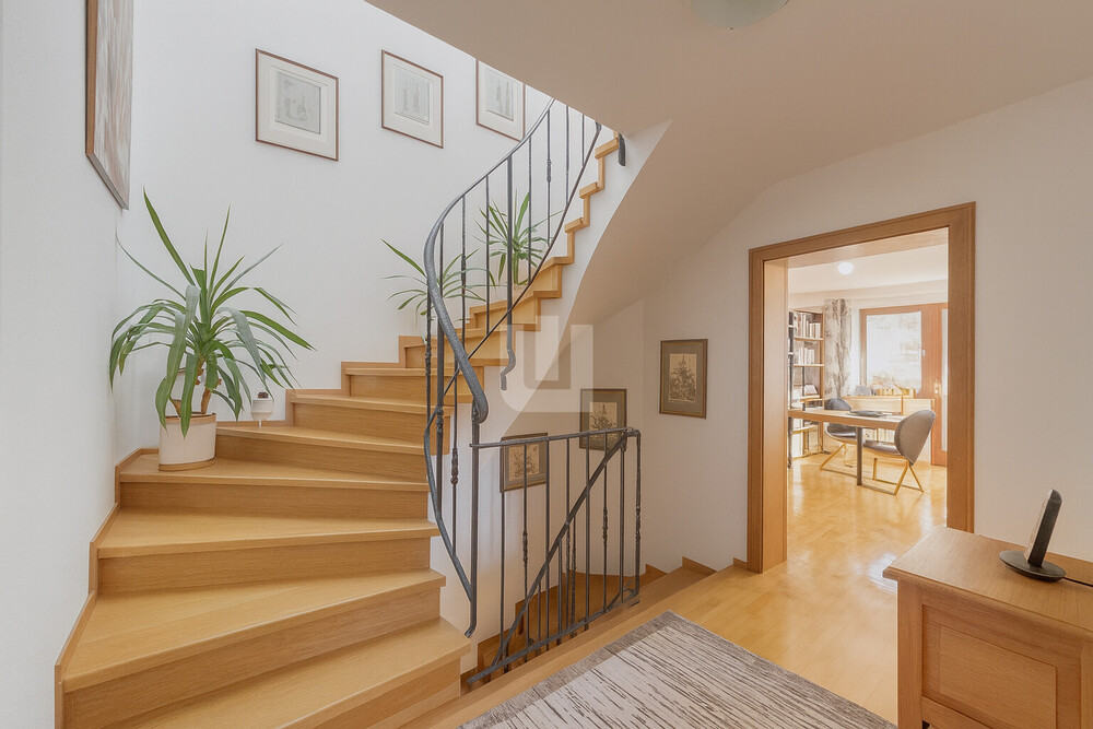DAS OBERGESCHOSS – jedes Familienmitglied hat sein eigenes Reich! Über das Treppenhaus gelangt man in das Obergeschoss, das mit einer angenehmen Raumhöhe von ca. 2, 50 m ein luftiges und wohnliches Gefühl vermittelt. Auf der linken Seite liegen zwei helle Zimmer, die sich wunderbar als Schlaf- oder Kinderzimmer eignen. Beide Räume verfügen über einen direkten Zugang zum Balkon, der sich großzügig um die Hausecke zieht. Der L-förmige Balkon bietet viel Platz für entspannte Stunden im Freien und ist dank eines praktischen Windfangs sowie Glaselemente auch als Wintergarten nutzbar. Rechtsseitig befindet sich ein weiteres Zimmer, das sich ideal als Ankleide oder individuell nutzbarer Rückzugsraum anbietet. Das Tageslichtbad ist funktional sowie großzügig gestaltet. Es verfügt über zwei Waschbecken, eine Dusche, eine Badewanne sowie ein großes Fenster, das für viel Licht und eine angenehme Atmosphäre sorgt.